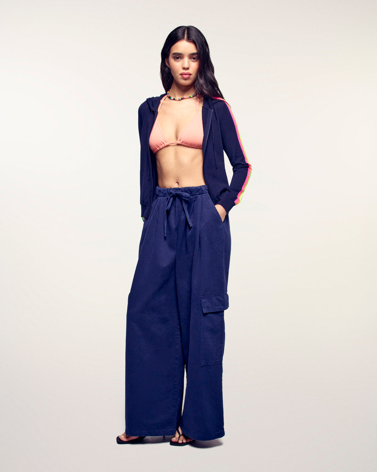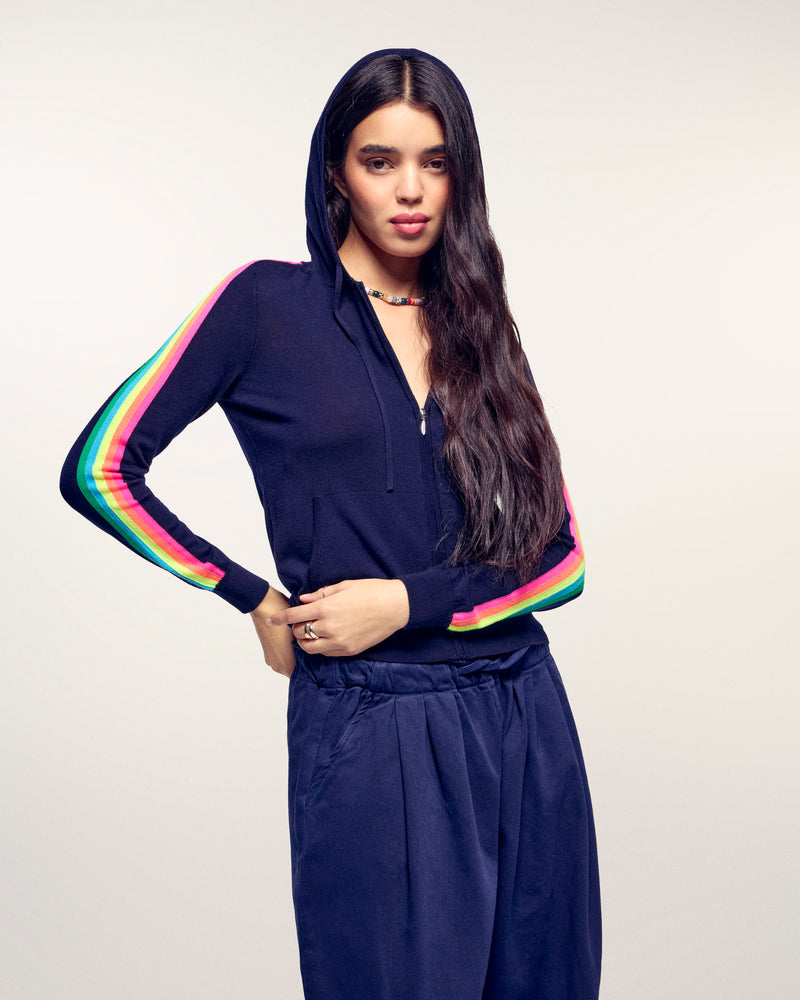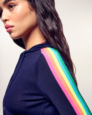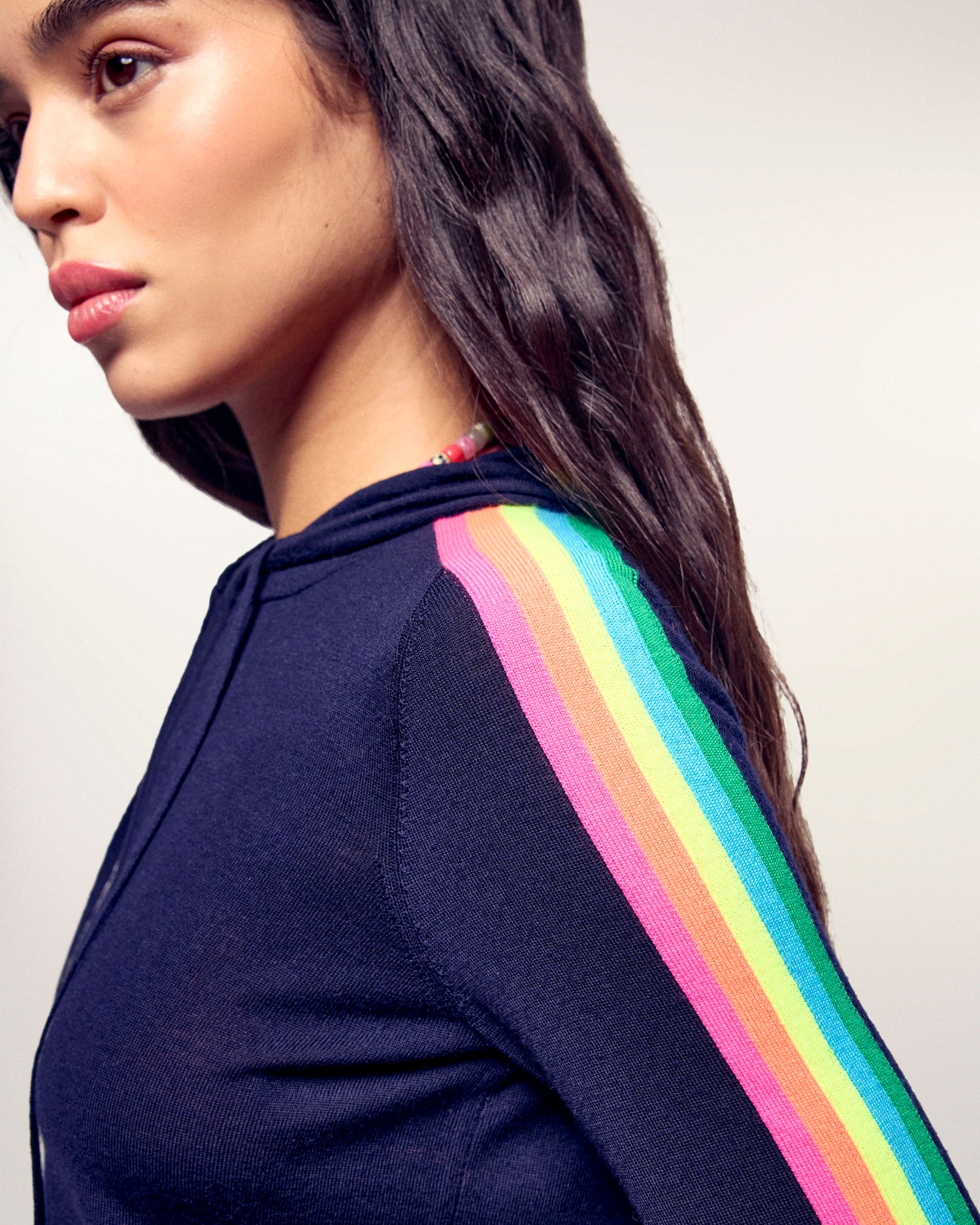 Une maille douce et moelleuse pour ce pull hoodie confectionné en laine mérinos 2 fils. Muni d'une capuche et d'une fermeture zippée, des bandes multicolores s'invitent le long des manches, signatures de l'allure From Future. Complétez votre look avec un jean ample ou un pantalon droit.