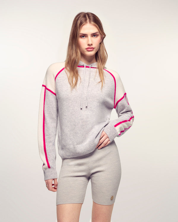 Confectionné en Cachemire 2 fils, ce pull hoodie offre une douceur exceptionnelle. Sa coupe regular est structurée par des empiècements tricolores aux lignes tubulaires contrastées, créant un effet color block audacieux et moderne.