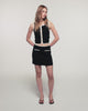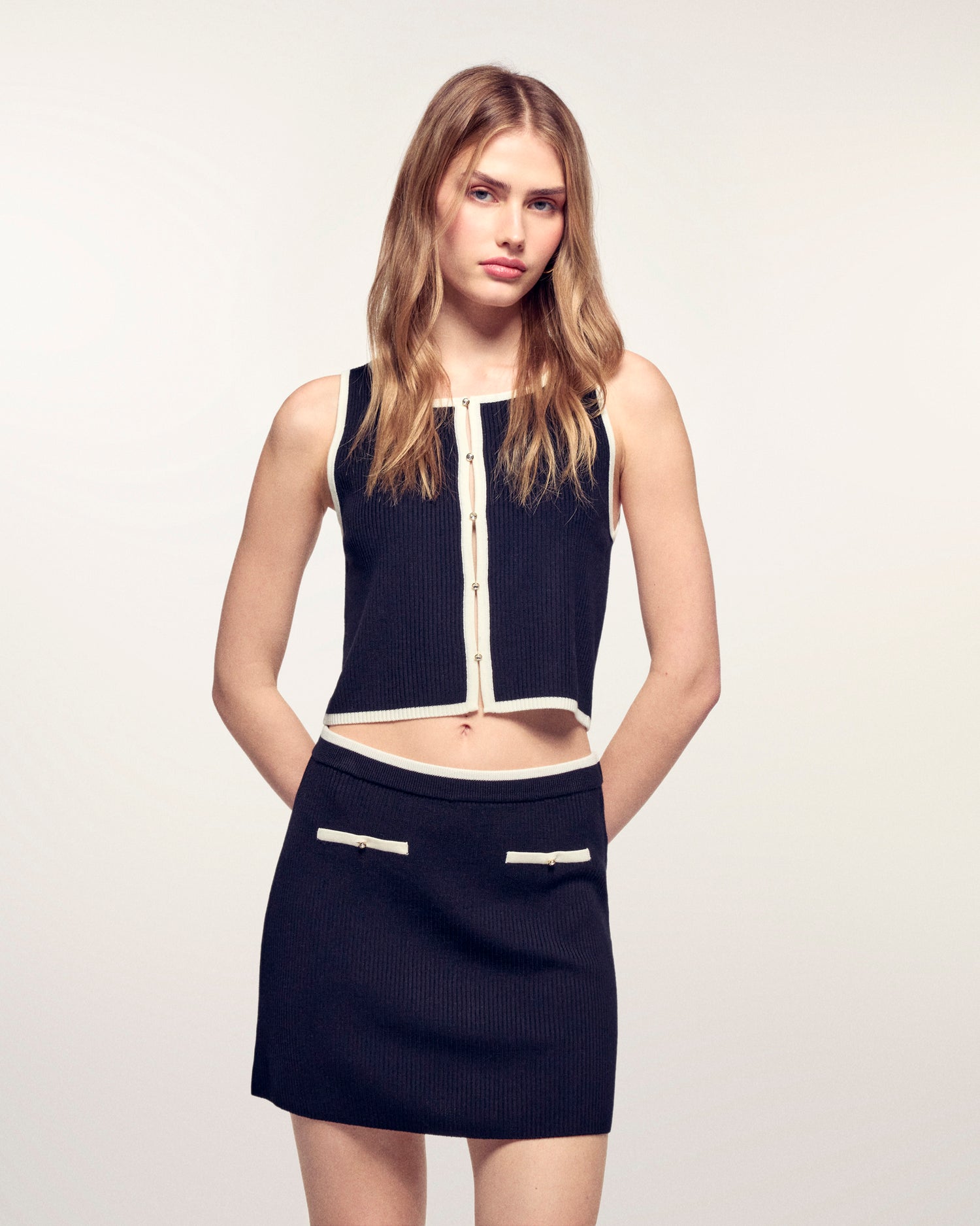 Une pièce graphique et sophistiquée qui joue sur les contrastes pour structurer la silhouette. Ce top se distingue par ses finitions tubulaires contrastées et son ouverture sur le devant ornée de boutons fantaisie en strass, offrant une allure à la fois moderne et précieuse.