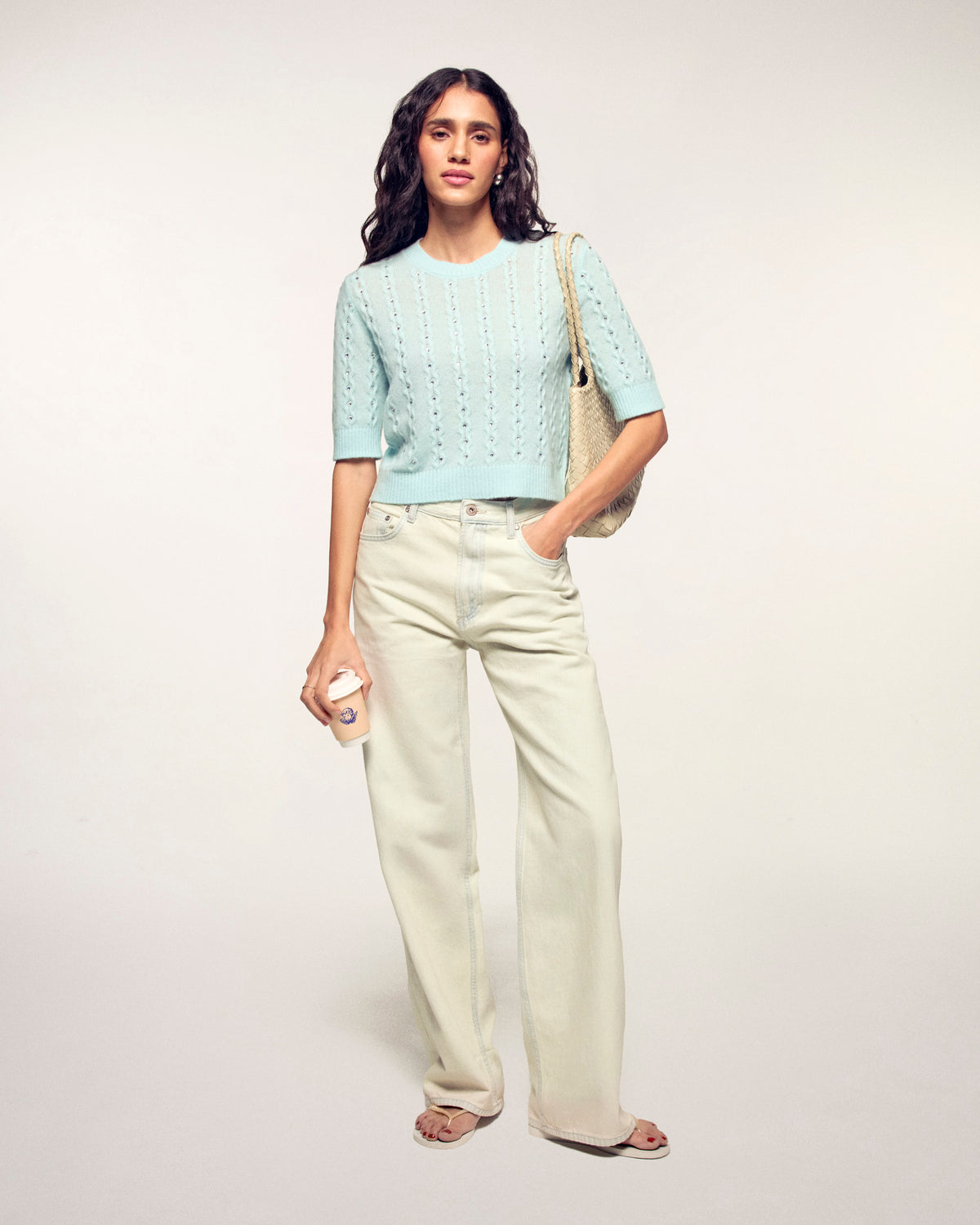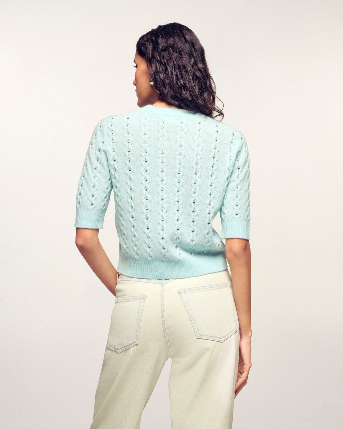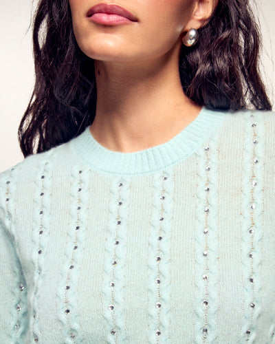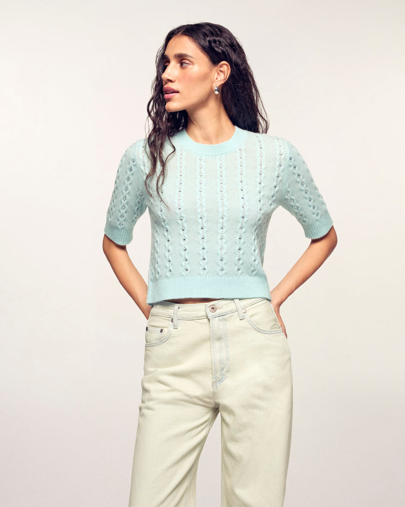 Une pièce précieuse et lumineuse qui revisite les classiques avec une touche d'éclat. Ce top en cachemire léger se distingue par son travail de torsades délicates sur l'ensemble du corps, sublimé par des strass intégrés pour une allure festive et sophistiquée.