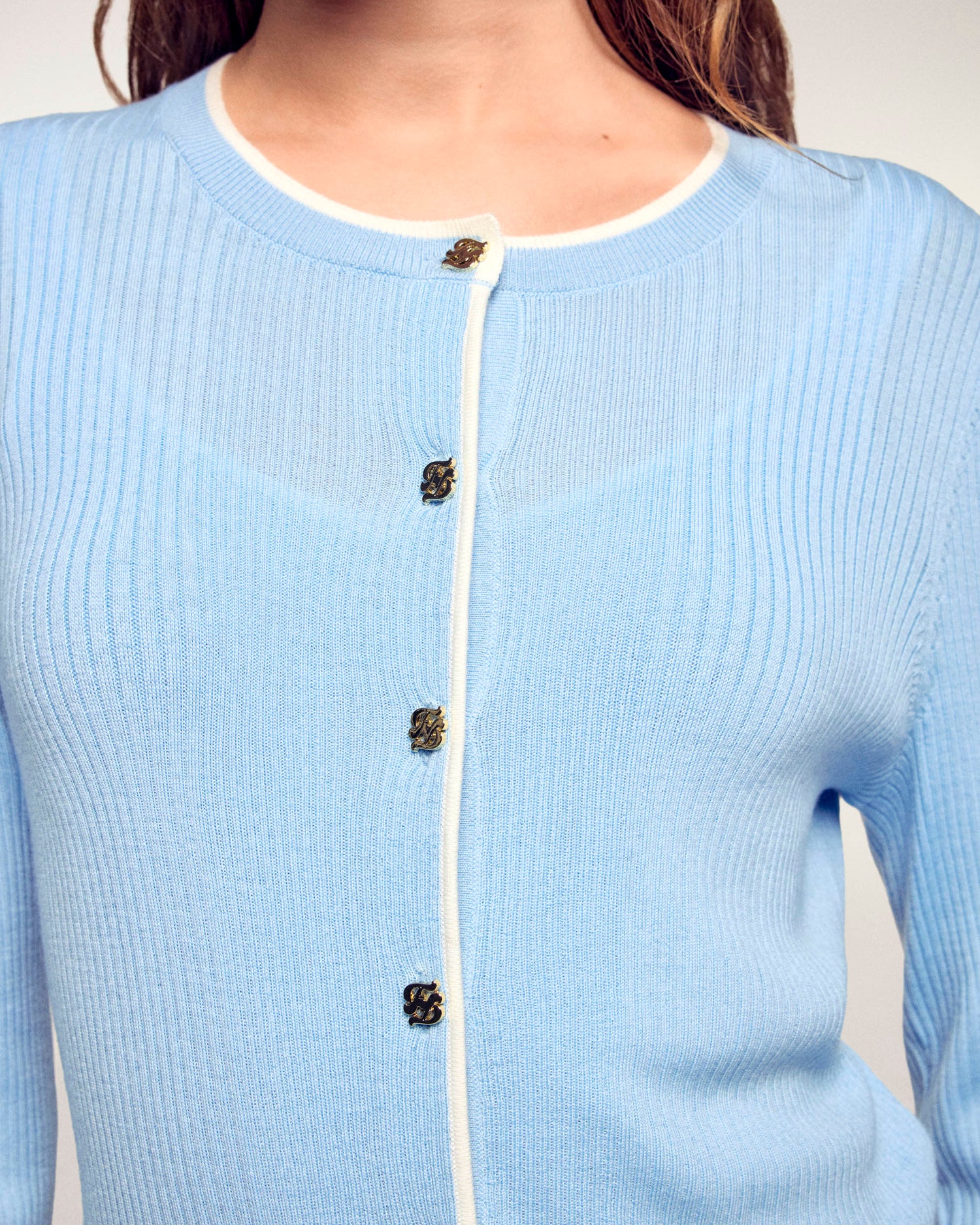 Ce cardigan à manches longues est confectionné en pure laine mérinos extrafine. Il présente une maille côtelée avec des finitions contrastées et se ferme par des boutons en plaque dorée siglés FF.