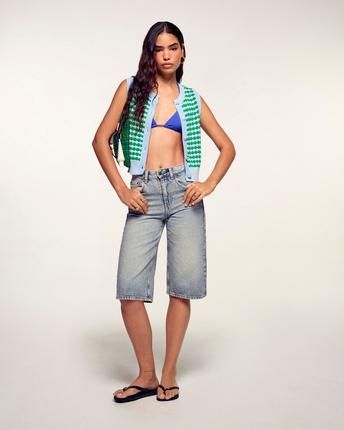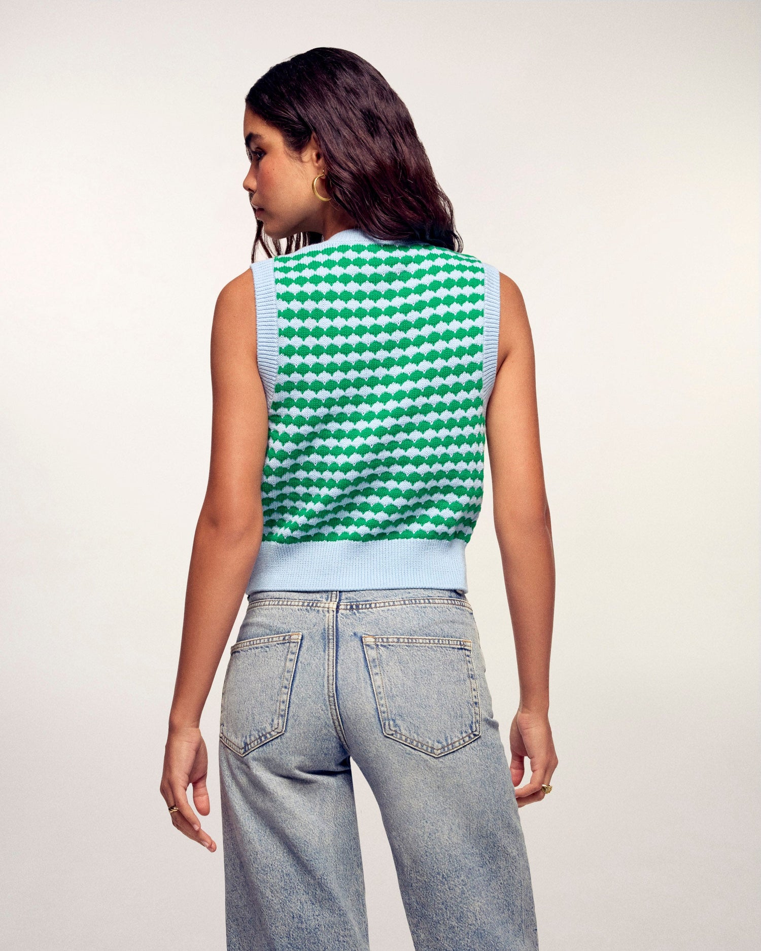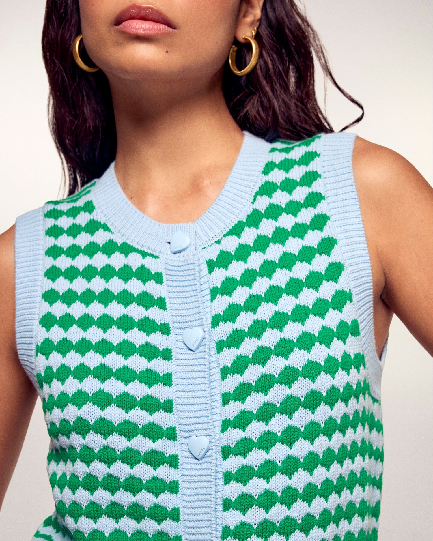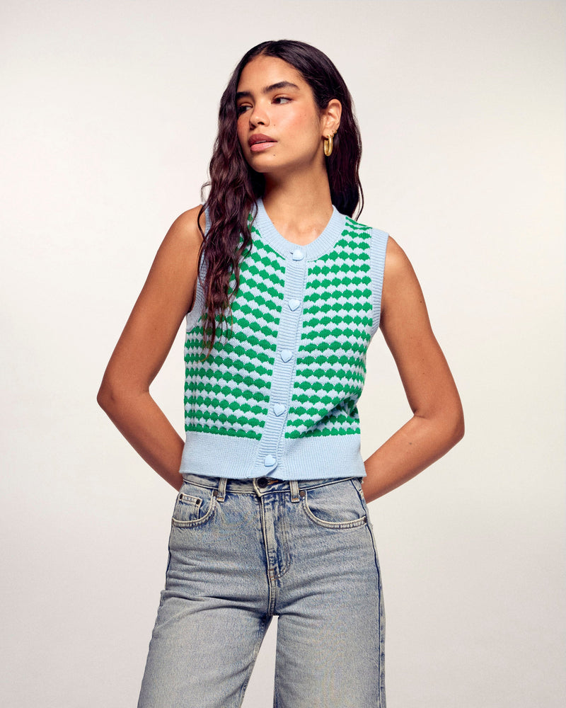 Le cardigan sans manches s'offre un look ludique et graphique pour la nouvelle saison. Confectionné dans un mélange doux de coton et de cachemire, il se distingue par son jeu de point bicolore en relief et ses boutons adorables en forme de cœur. Sa coupe regular et courte en fait la pièce idéale à superposer pour une silhouette moderne et pleine de pep's.