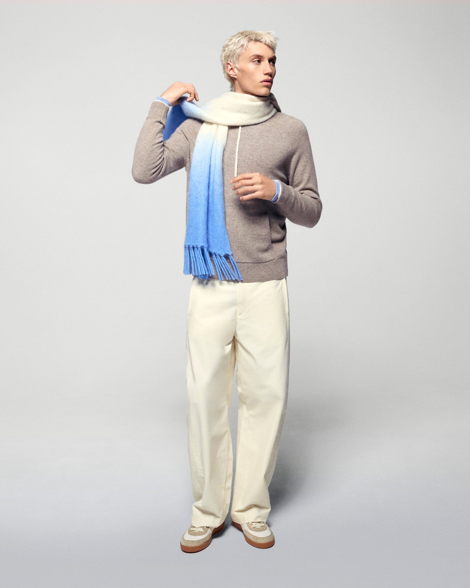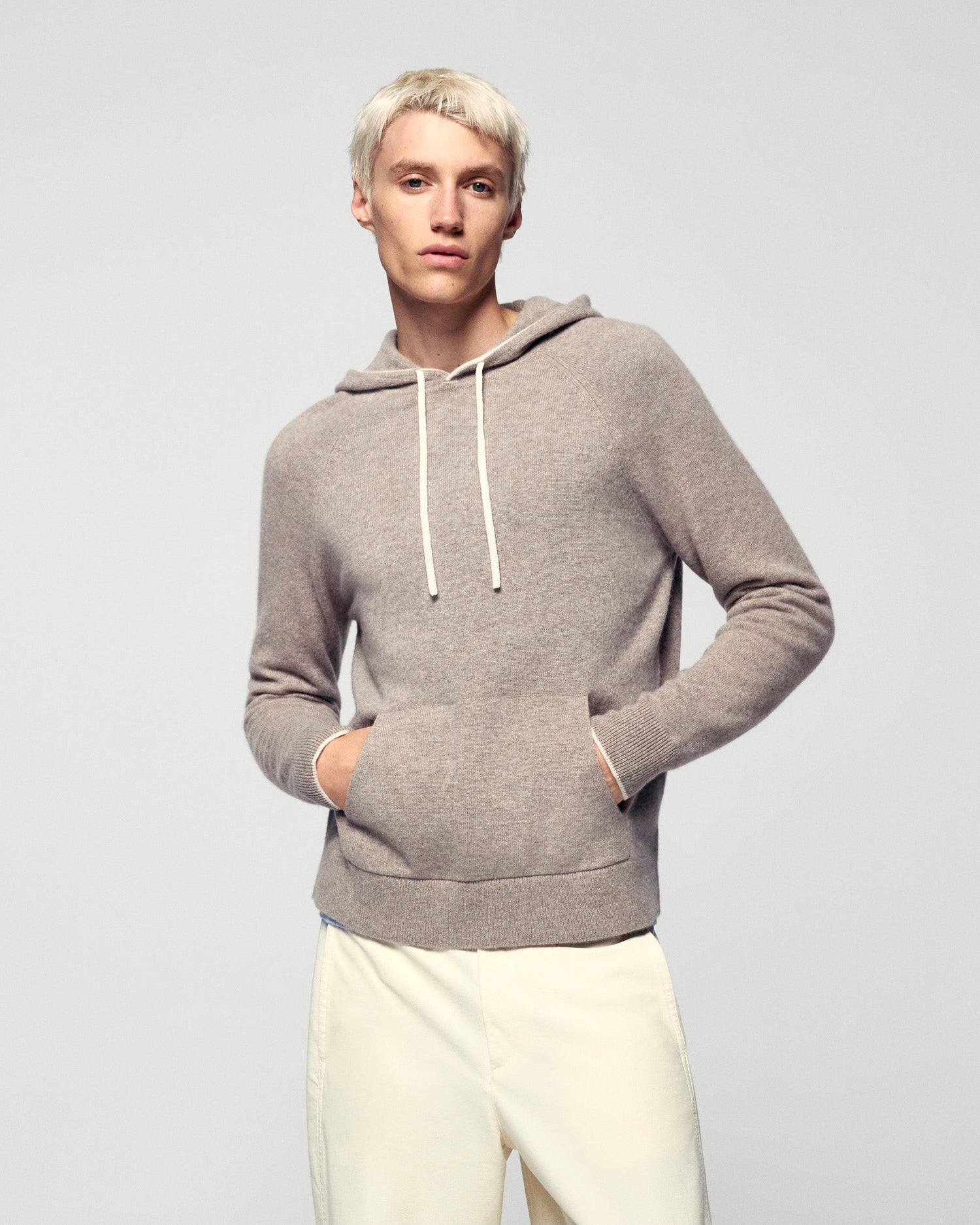 L'incontournable pull hoodie se réinvente cette saison orné de liserés contrastés. Confectionné en cachemire, il dévoile une capuche à cordons, des manches longues et des bords côtelés.