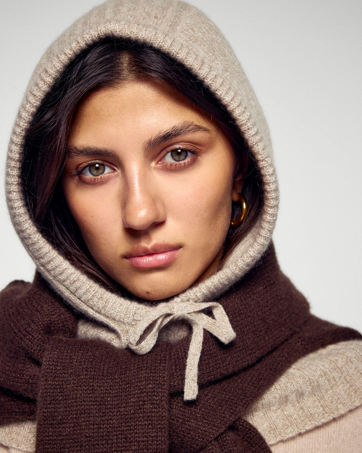 Enveloppez-vous de douceur avec cette cagoule côtelée confectionnée en cachemire. Dotée de liens de serrage pour un ajustement parfait, elle réchauffe votre silhouette avec une touche d'élégance à vos looks de saison.