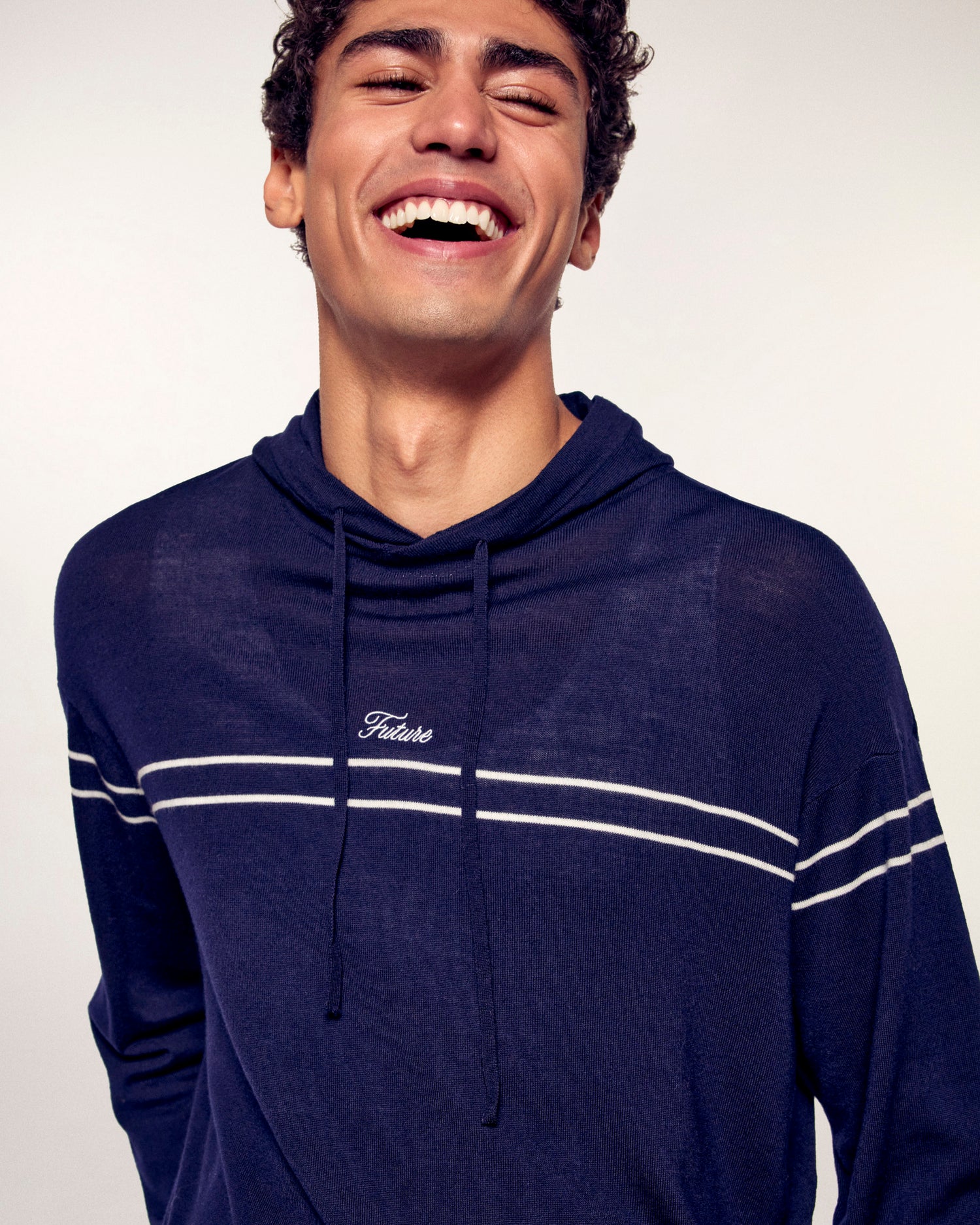 Un pull à capuche confectionné en laine mérinos, affichant un style urbain et raffiné grâce à sa broderie "Future" et ses fines rayures horizontales. Ses finitions soignées en font une pièce polyvalente, idéale pour un look décontracté mais élégant.