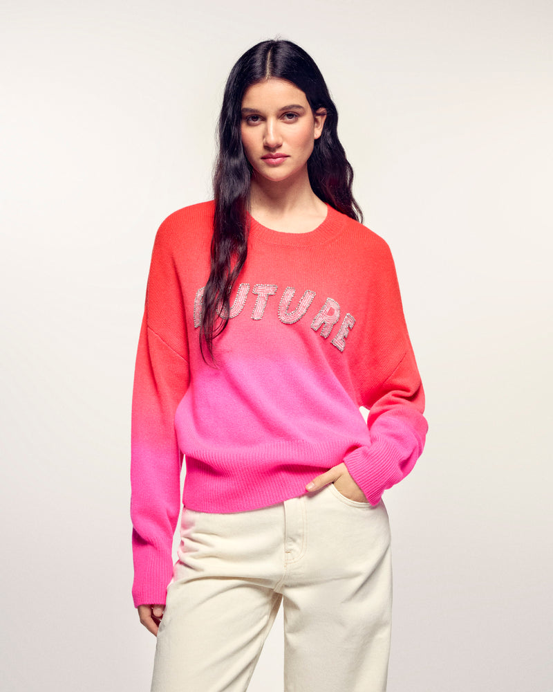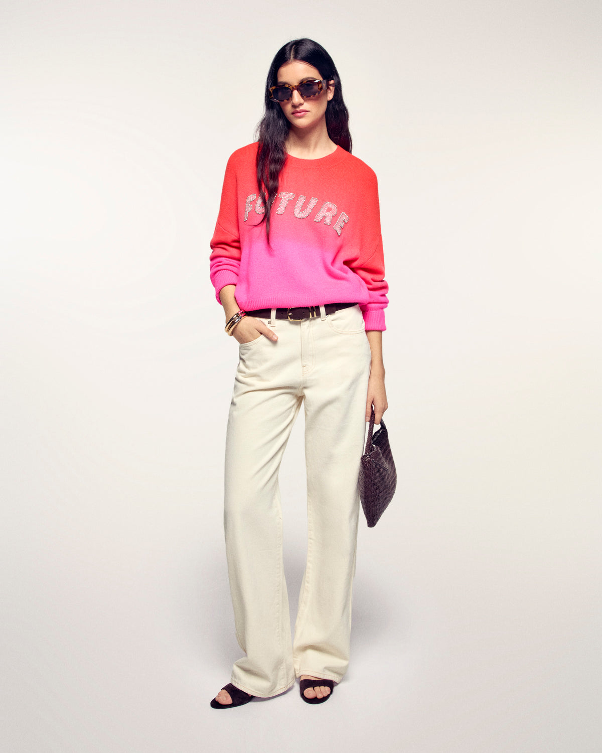 Le pull audacieux au design futuriste. Confectionné en Cachemire 4 fils, ce pull offre une maille douce et un tombé confortable. Sa coupe regular est twistée par un grand patch brodé du mot "FUTURE" avec des perles, ajoutant une touche scintillante et ultra-moderne.