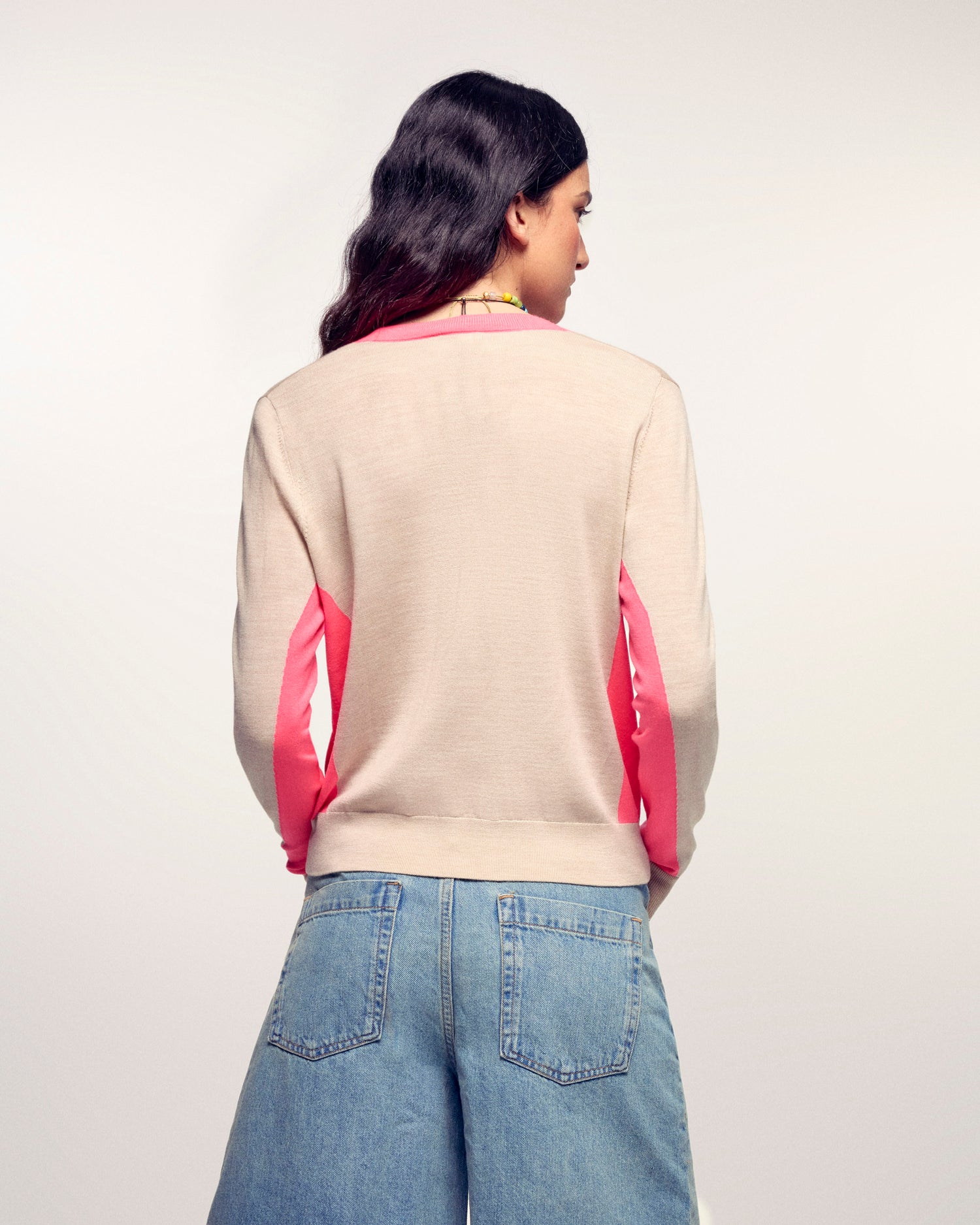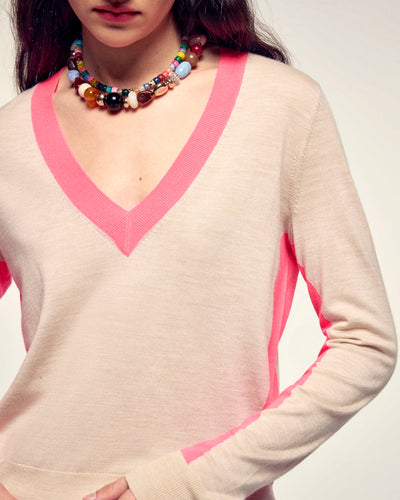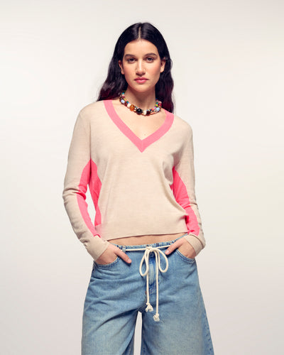 Confectionné en Laine Mérinos 2 fils, il offre une maille douce et légère. Sa coupe regular est dynamisée par des bandes contrastées sur les manches et le bas du corps, créant un effet color block tendance.