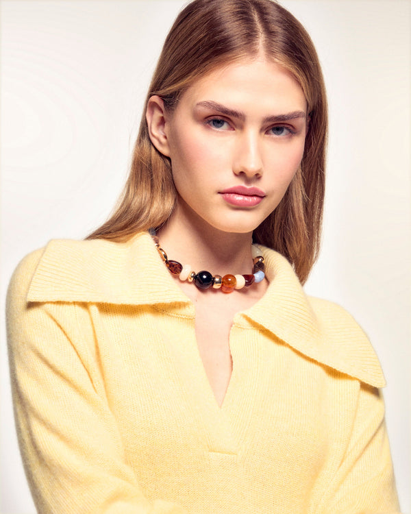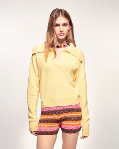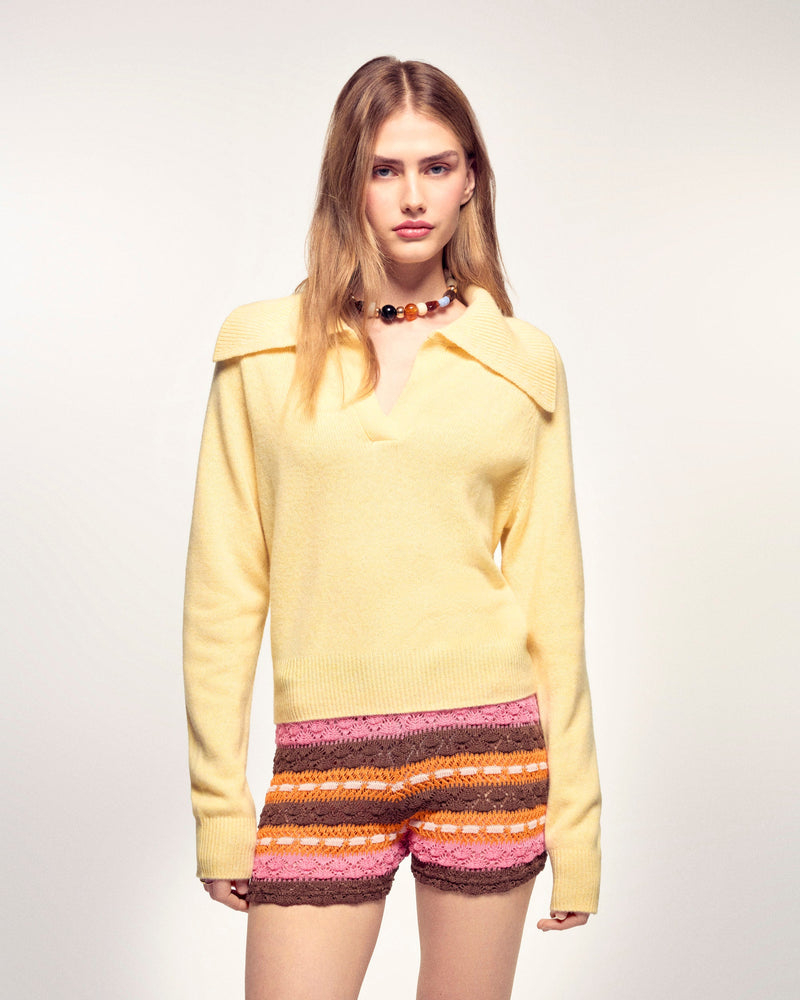 Le pull chic au confort maximal. Confectionné en Cachemire 4 fils, il présente une maille moulinée et un tombé oversize. Son col polo large et structuré apporte une touche sophistiquée, idéale pour un look décontracté-élégant.