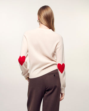 Le pull qui ajoute une touche de fantaisie romantique. Confectionné en Cachemire 2 fils, ce pull col rond offre une maille douce et légère. Sa coupe regular est dynamisée par des coudières jacquard en forme de cœur qui contrastent sur les manches.