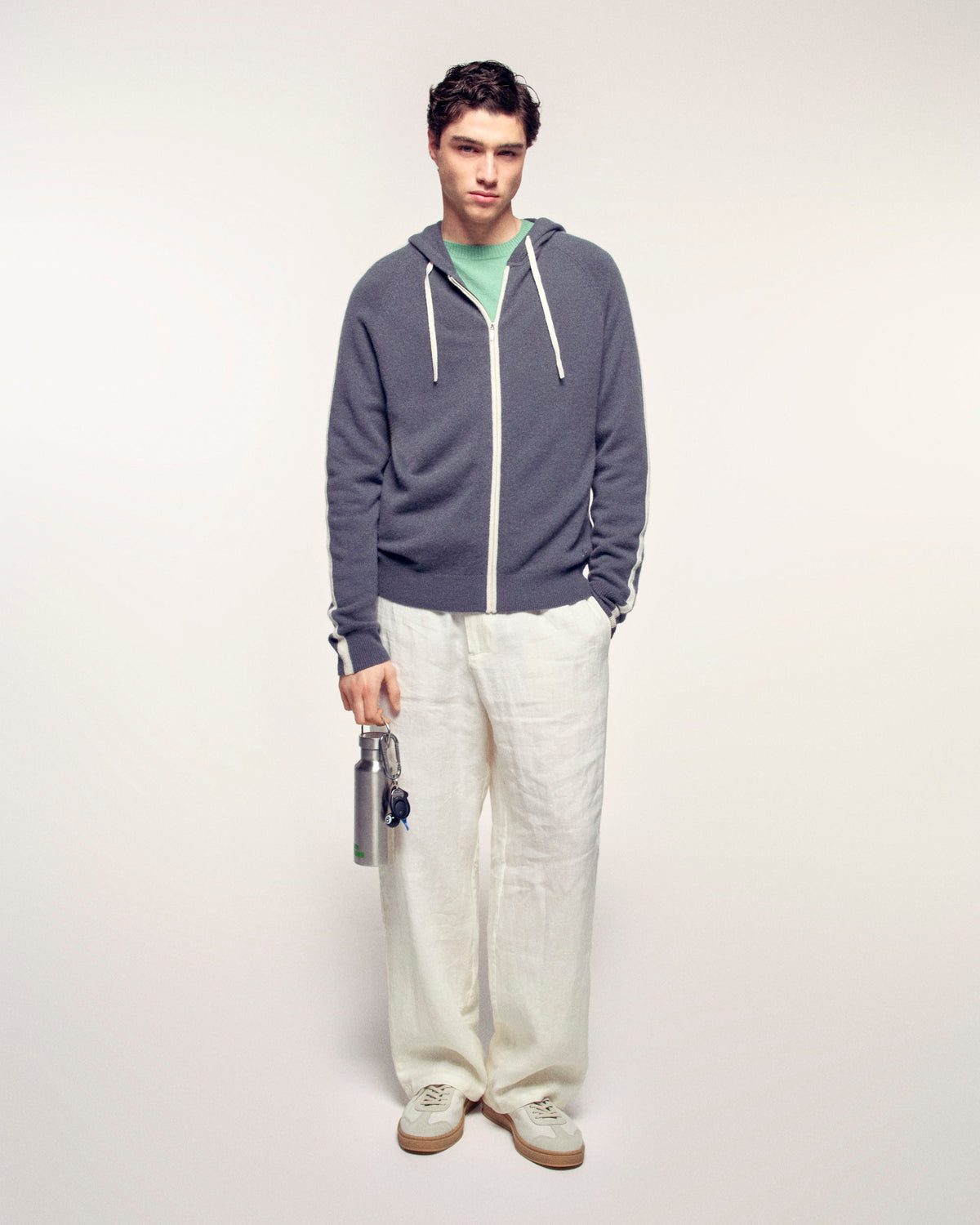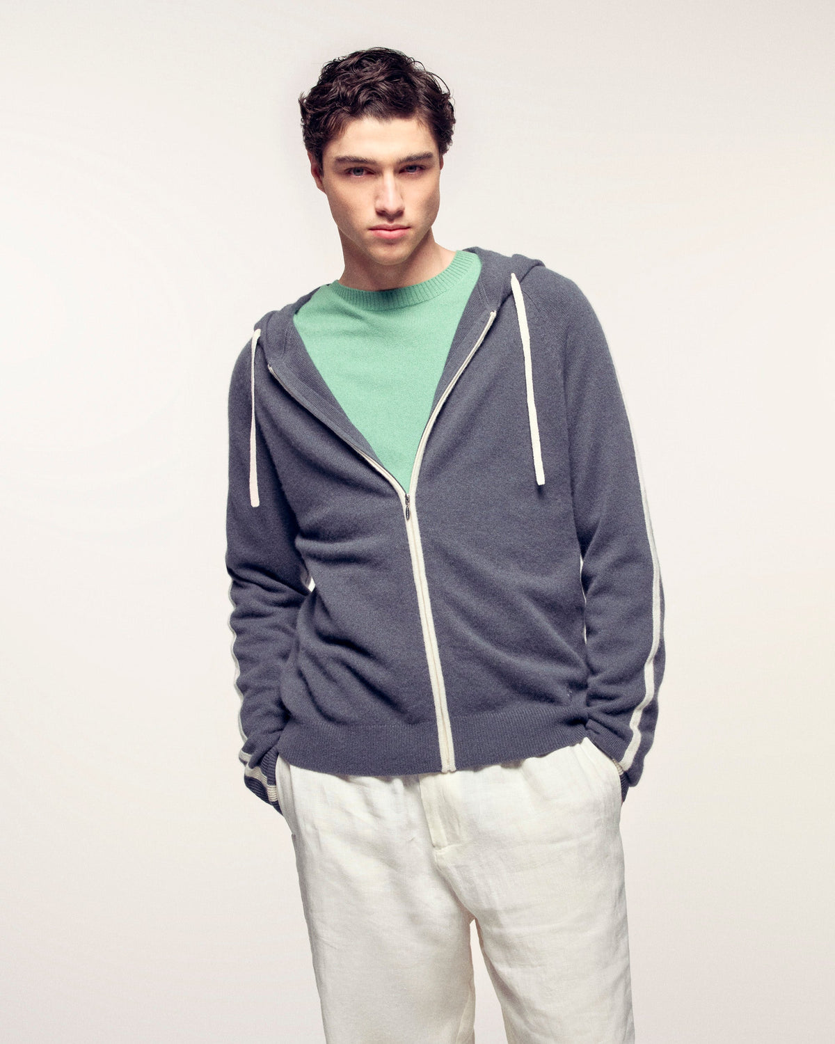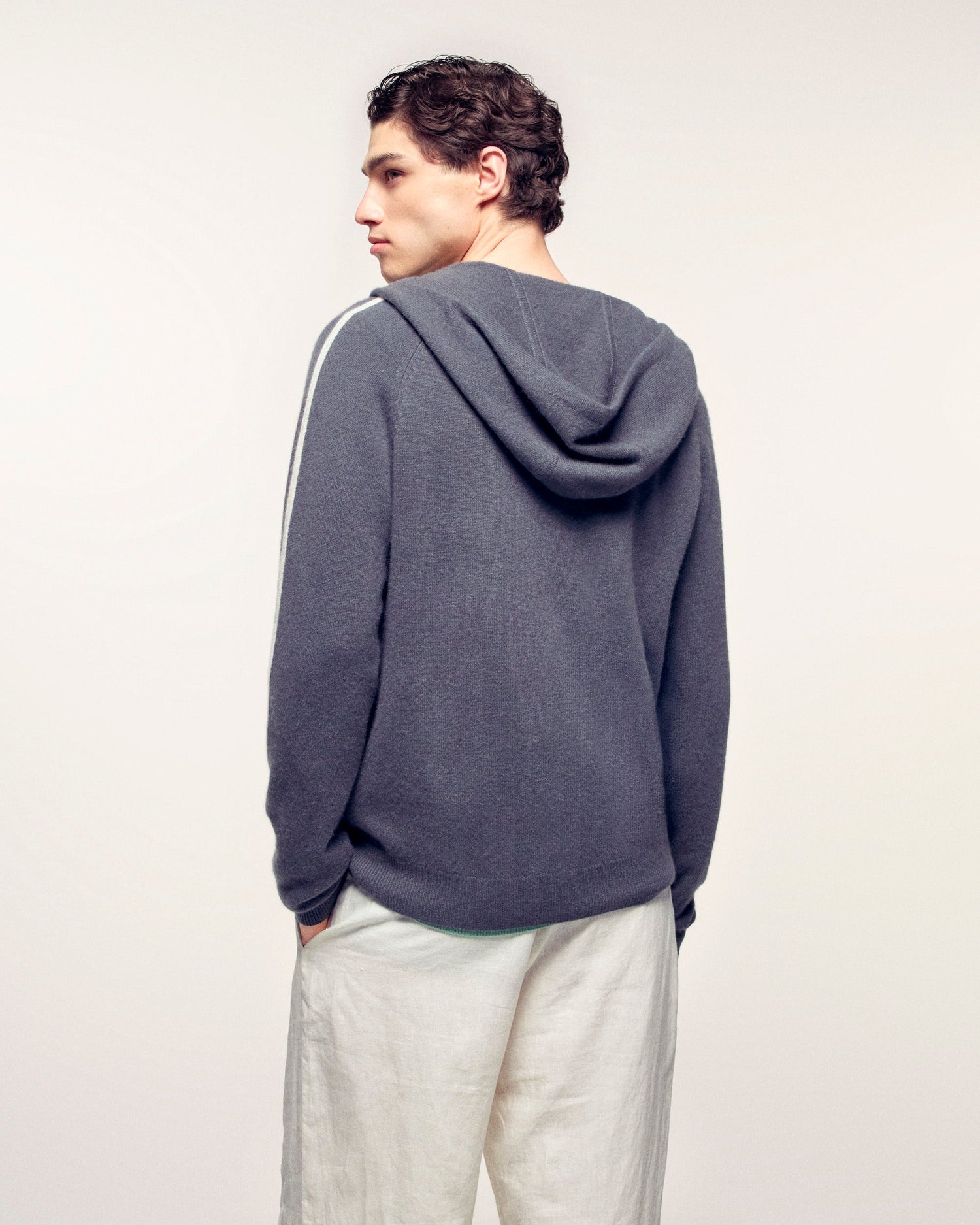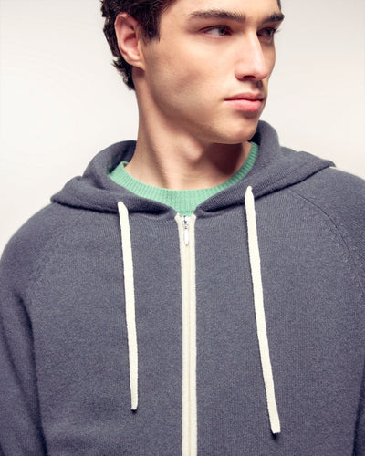 Pull Hoodie Bandes et Cordons Contrastés - 100% Cachemire - Vérifié GCS - Storm Grey
