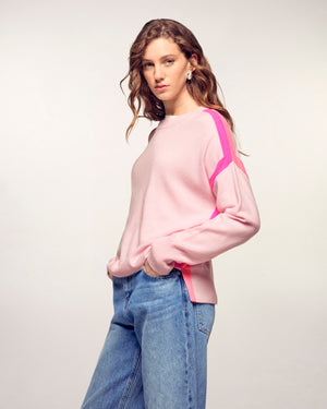 Ce pull à col rond est confectionné en 100% cachemire léger pour un porté doux et fluide. Il se distingue par sa coupe oversize et ses détails de liserés contrastés qui soulignent les manches et les côtés. Une pièce moderne et confortable au style épuré.