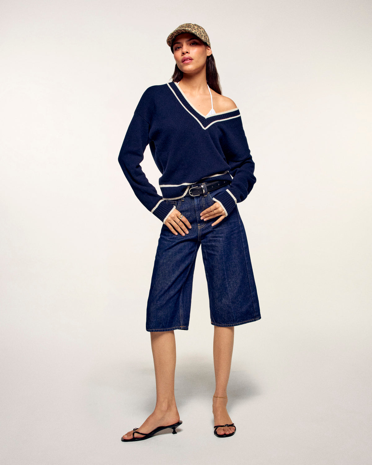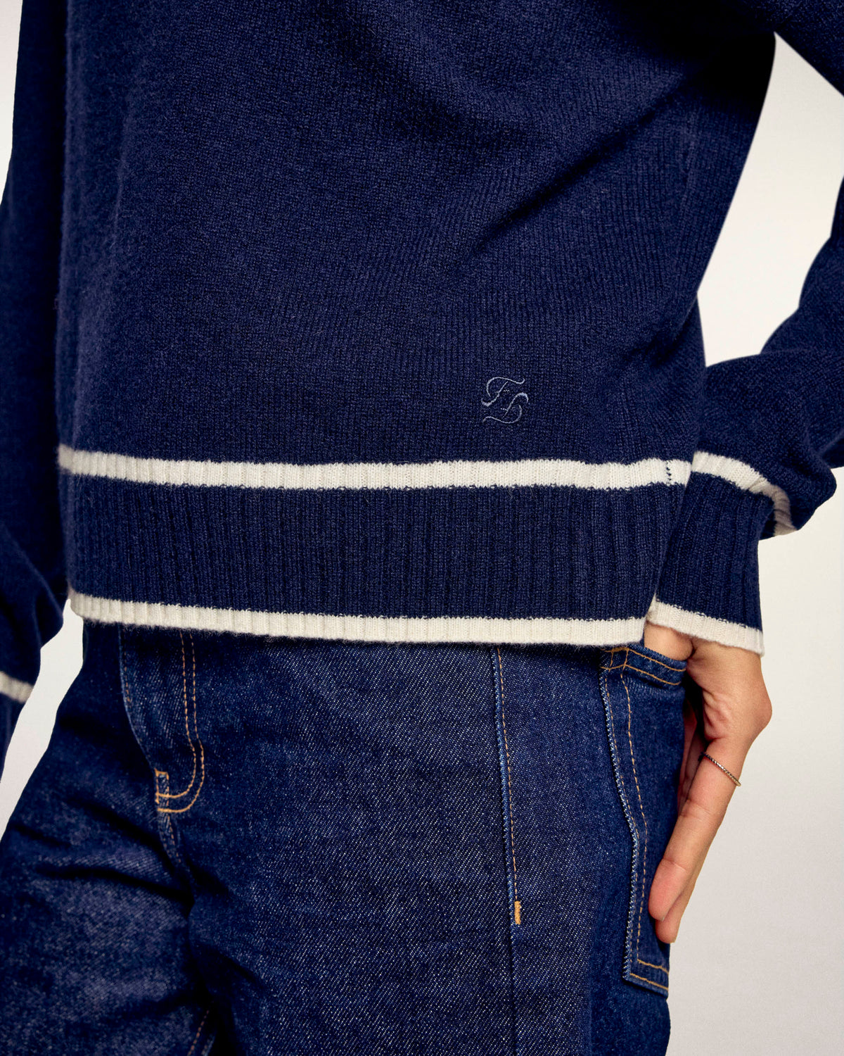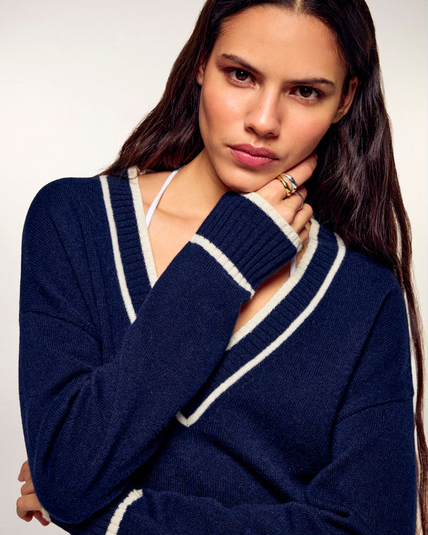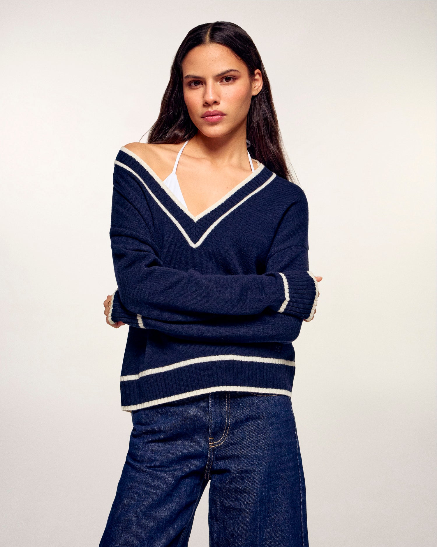 Pull Pull Col V à Lisérés - 100% Cachemire - Vérifié GCS - Navy