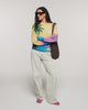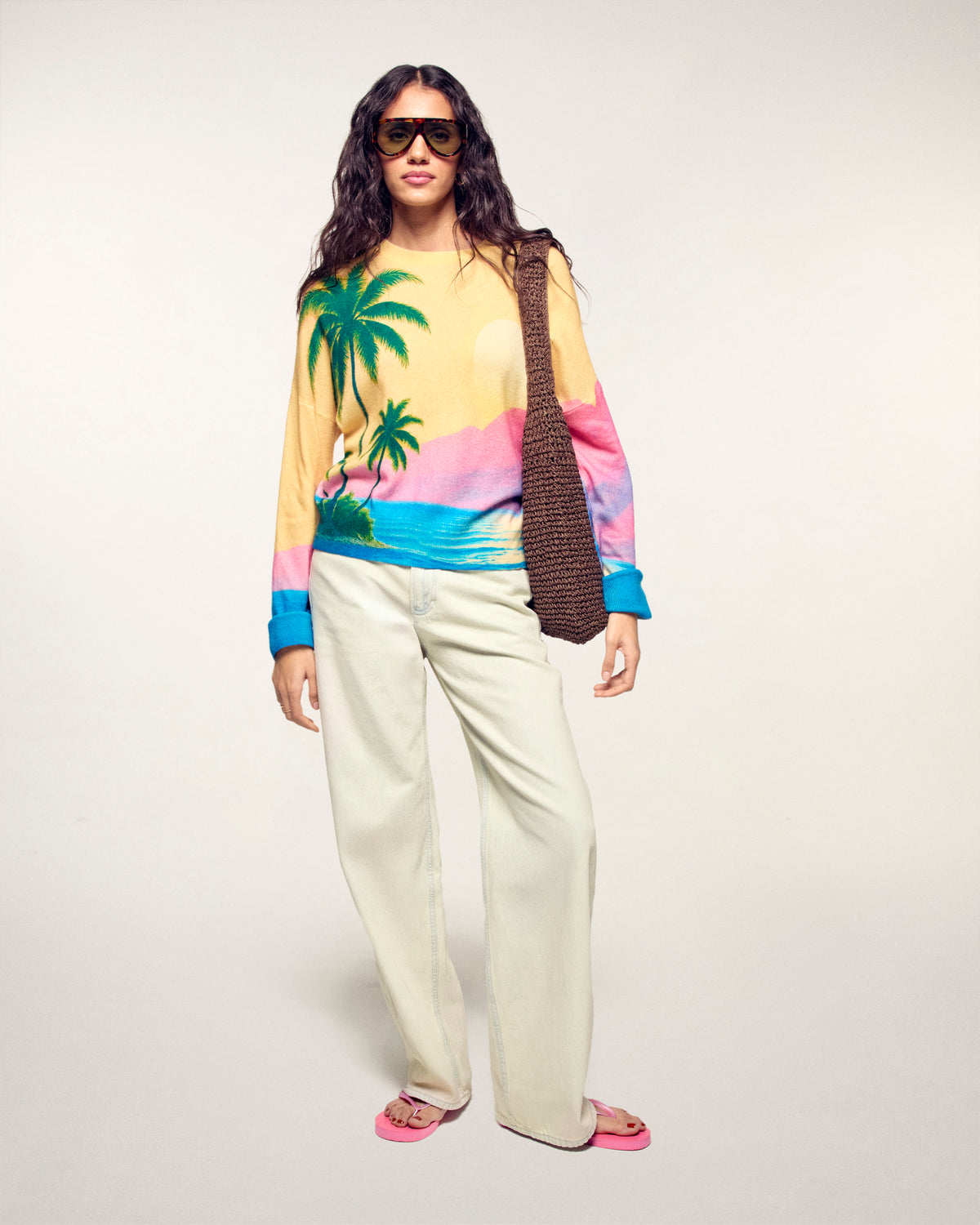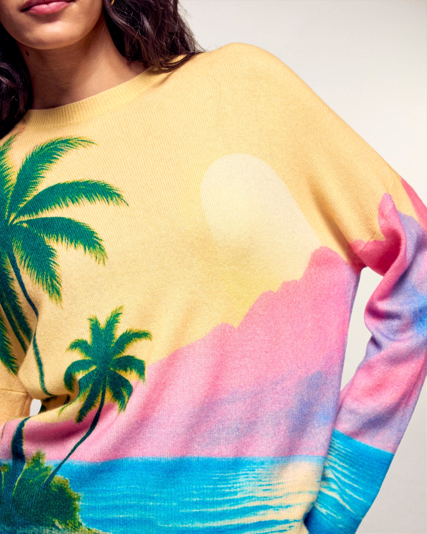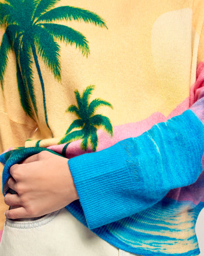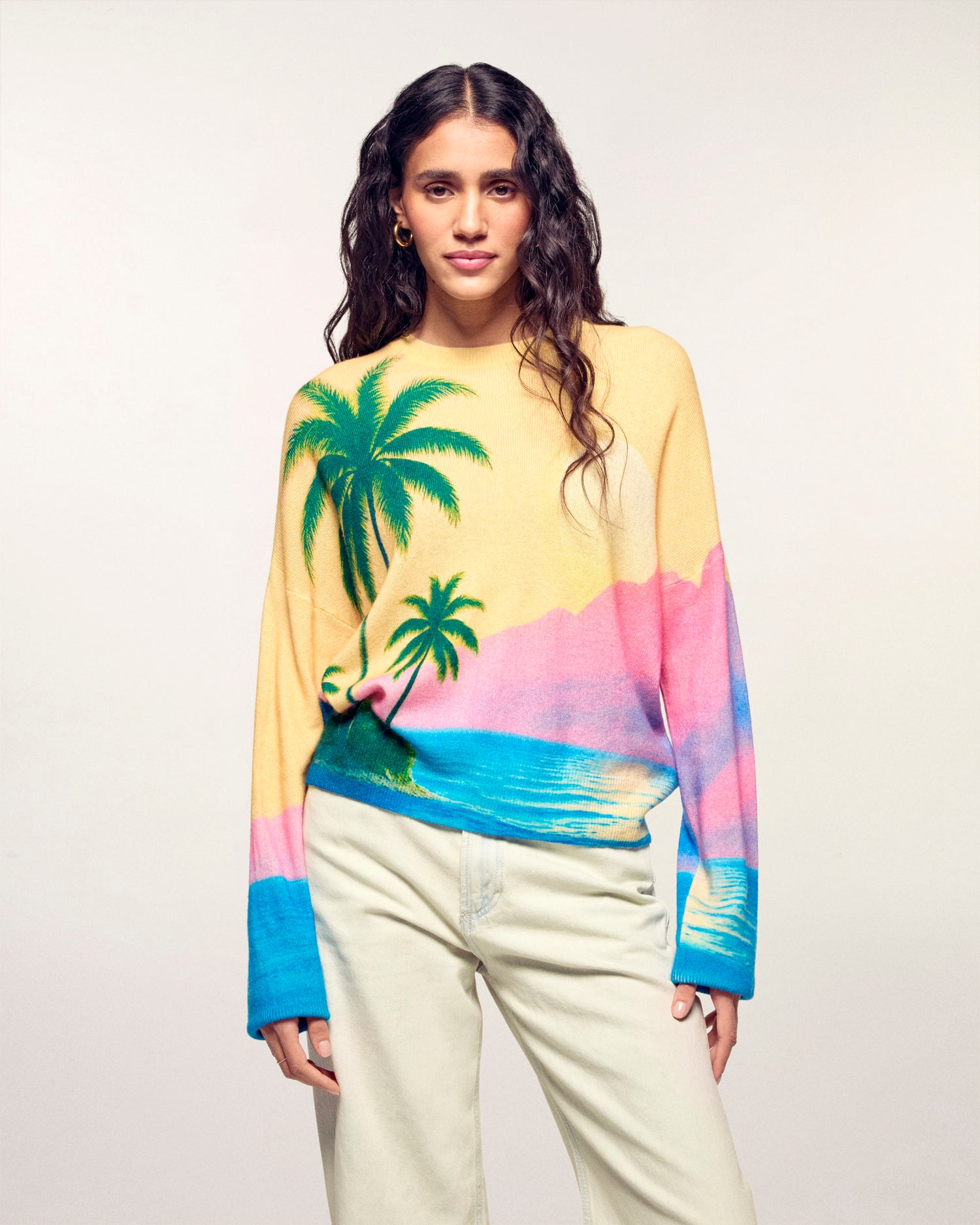 Le pull qui vous transporte directement sous les tropiques. Confectionné en Cachemire 2 fils, ce pull col rond offre une maille douce et légère. Sa coupe oversize est mise en valeur par un imprimé intégral vibrant représentant un coucher de soleil et des palmiers.