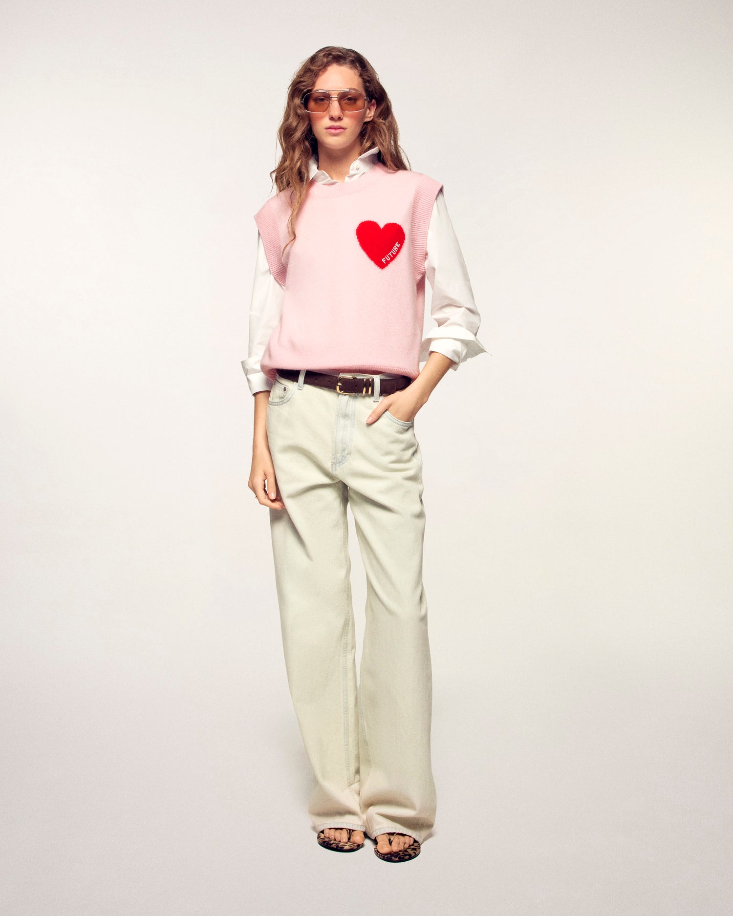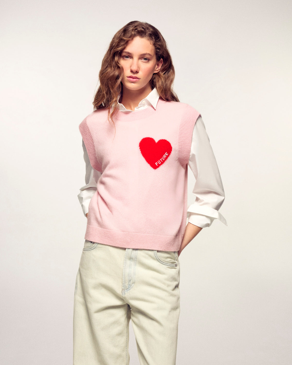 Mêlant légèreté et douceur, ce pull sans manches court et oversize 100% cachemire est muni d'un col rond. Le détail signature ? Un cœur rouge brodé "FUTURE" se dévoile sur la poitrine. Portez-le seul ou glissé sur une chemise pour un look sophistiqué.