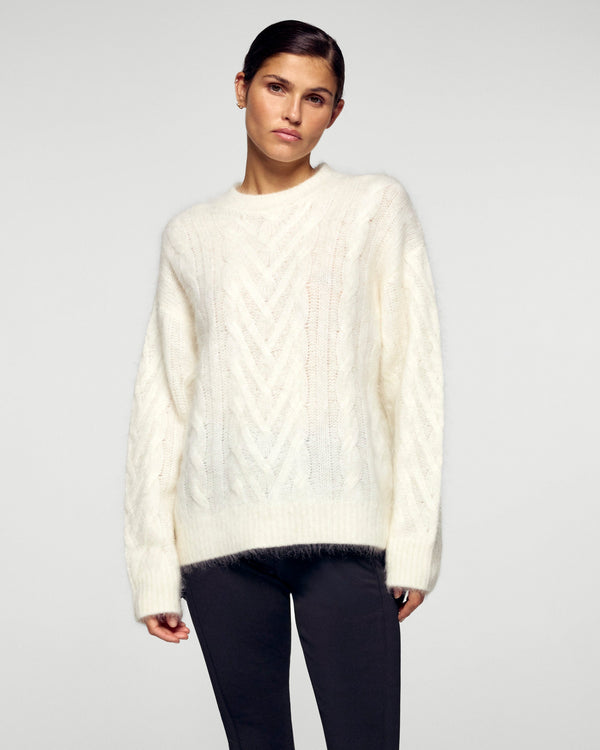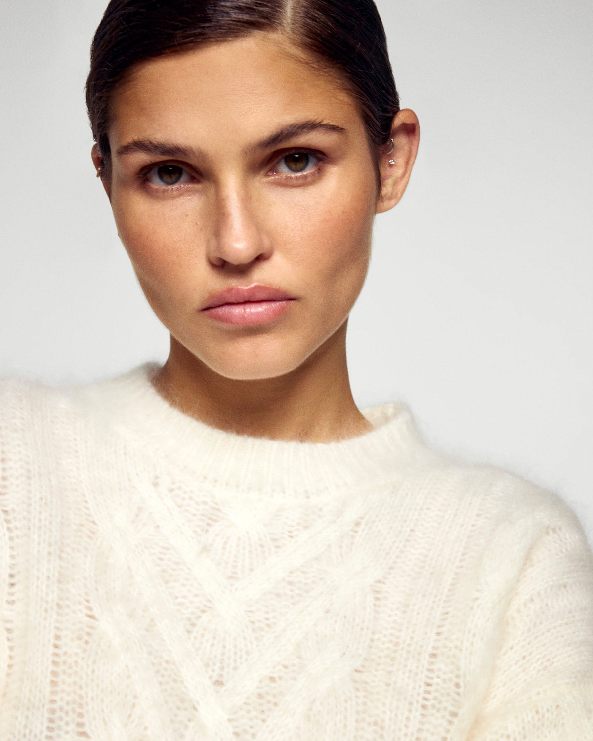 Pull en 100% Cachemire brossé au toucher vaporeux, travaillé en maille torsadée. Sa coupe oversize et son volume souple offrent une allure enveloppante et élégante.