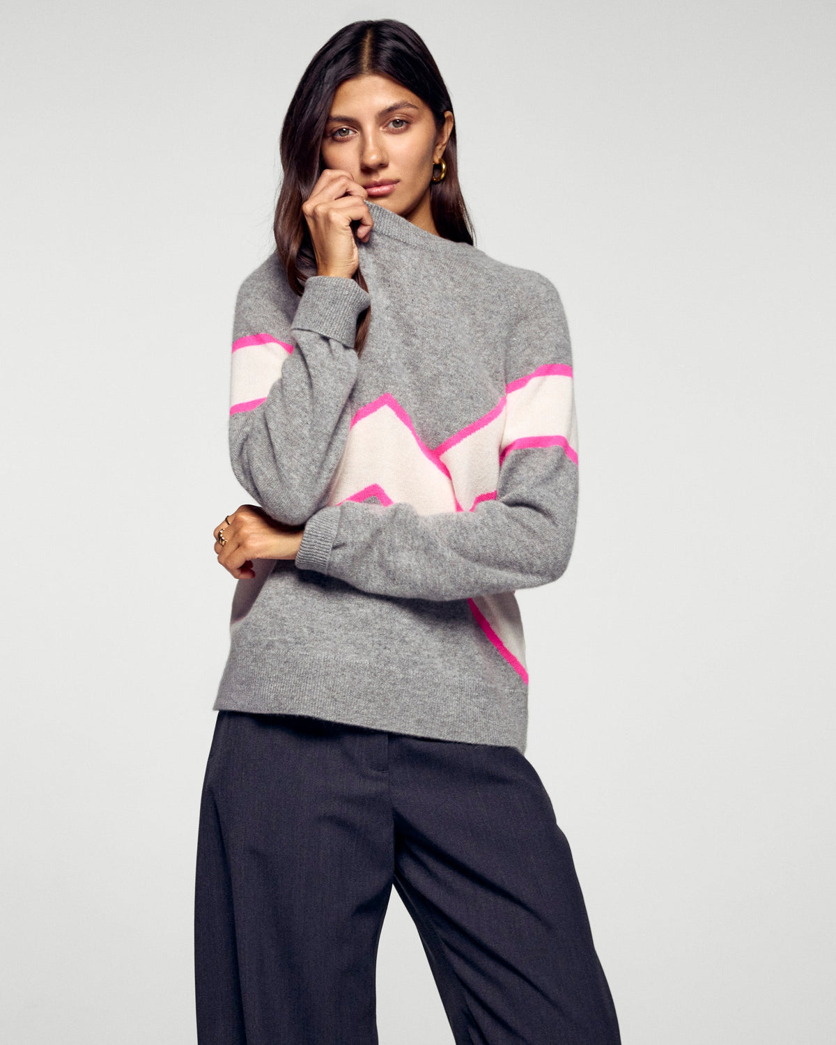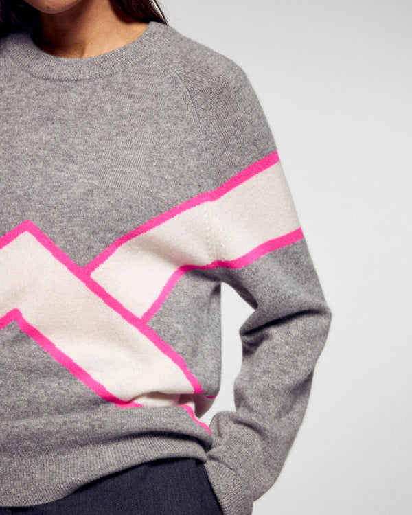 Pull en 100% Cachemire au design graphique contrasté sur la poitrine et les manches. Sa coupe oversize et son col rond légèrement loose apportent confort et modernité.