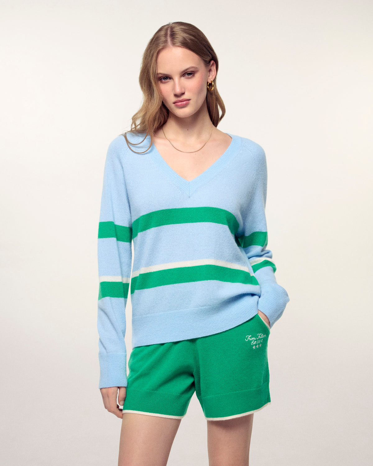 Confectionné en Cachemire, ce pull offre une maille douce et un tombé confortable. Sa coupe regular et son élégant col V sont dynamisés par des rayures bicolores sur la poitrine et les manches, soulignant la silhouette.