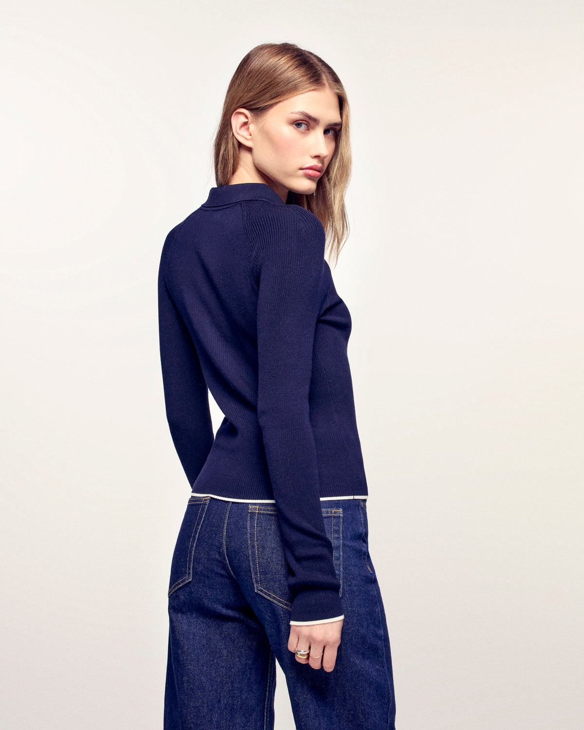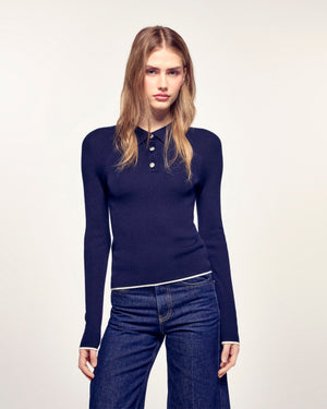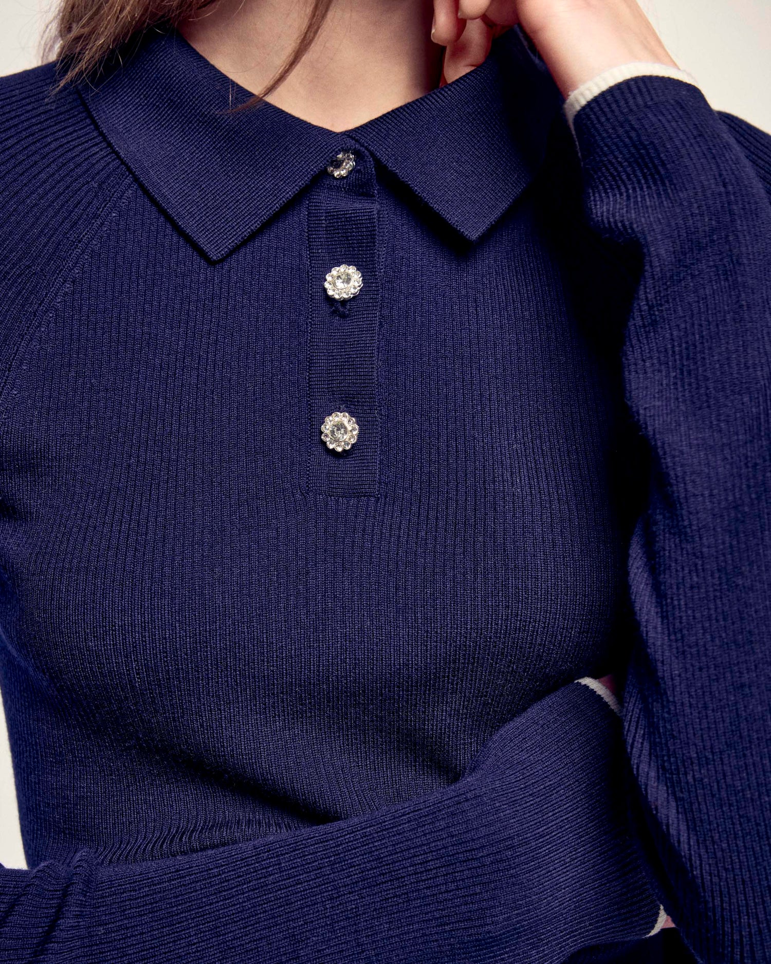 Le polo en maille qui allie élégance et modernité. Confectionné en Laine Mérinos Extrafine 2 fils, il offre une maille finement côtelée, douce et légère. Sa coupe slim et son col polo sont sublimés par des boutons fantaisie en forme de fleurs/bijoux, ajoutant une touche de raffinement et de brillance.