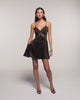 Une silhouette féminine et raffinée pour cette robe courte confectionnée en satin de soie. Elle se distingue par ses jeux de transparences avec des découpes en dentelle délicate qui soulignent le buste et la taille, offrant une allure à la fois sophistiquée et moderne.