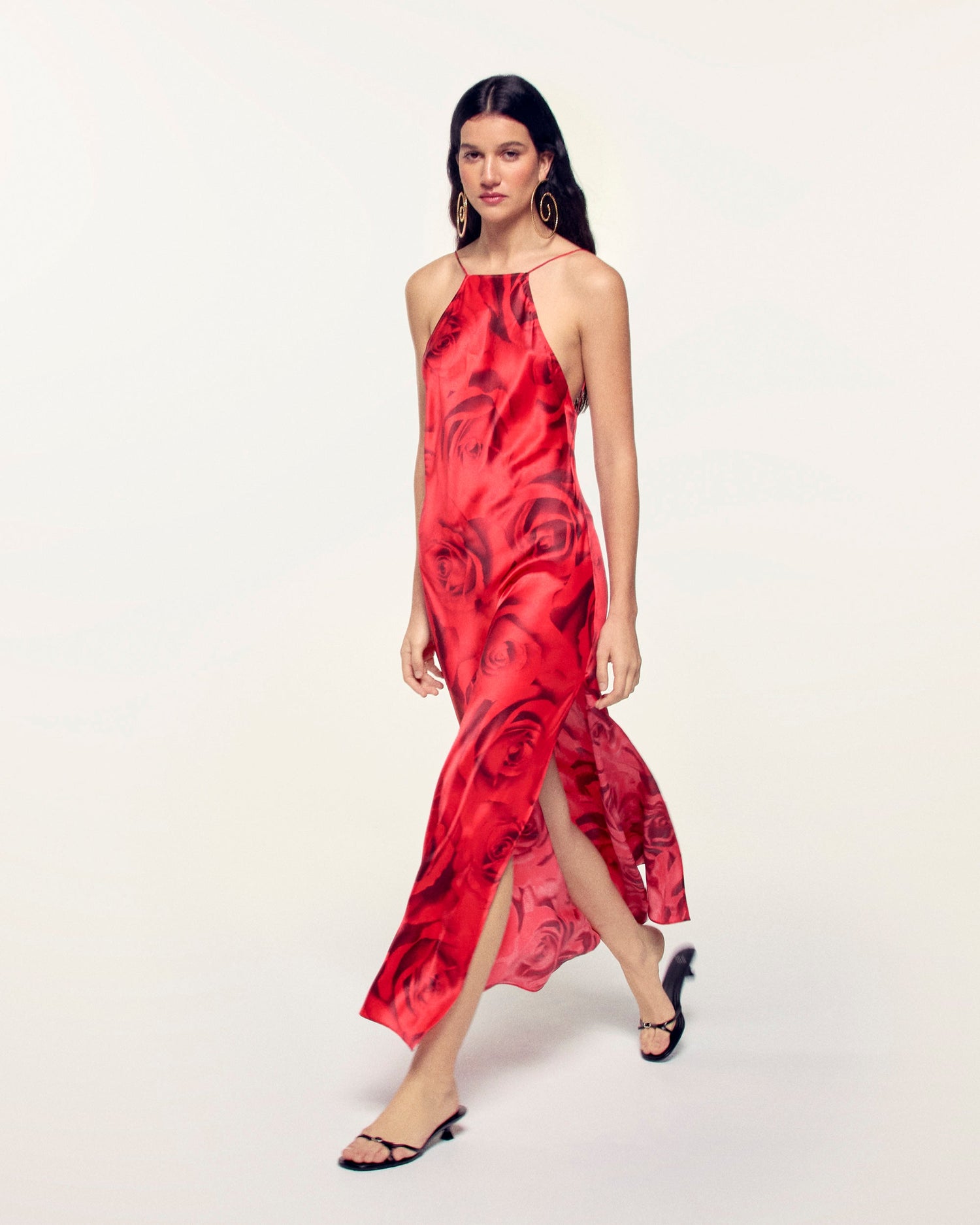 Confectionnée en 100% Soie pour un tombé fluide et luxueux, cette pièce est sublimée par son dos nu spectaculaire et son imprimé rose audacieux. Une coupe slim longue qui garantit une allure sophistiquée.