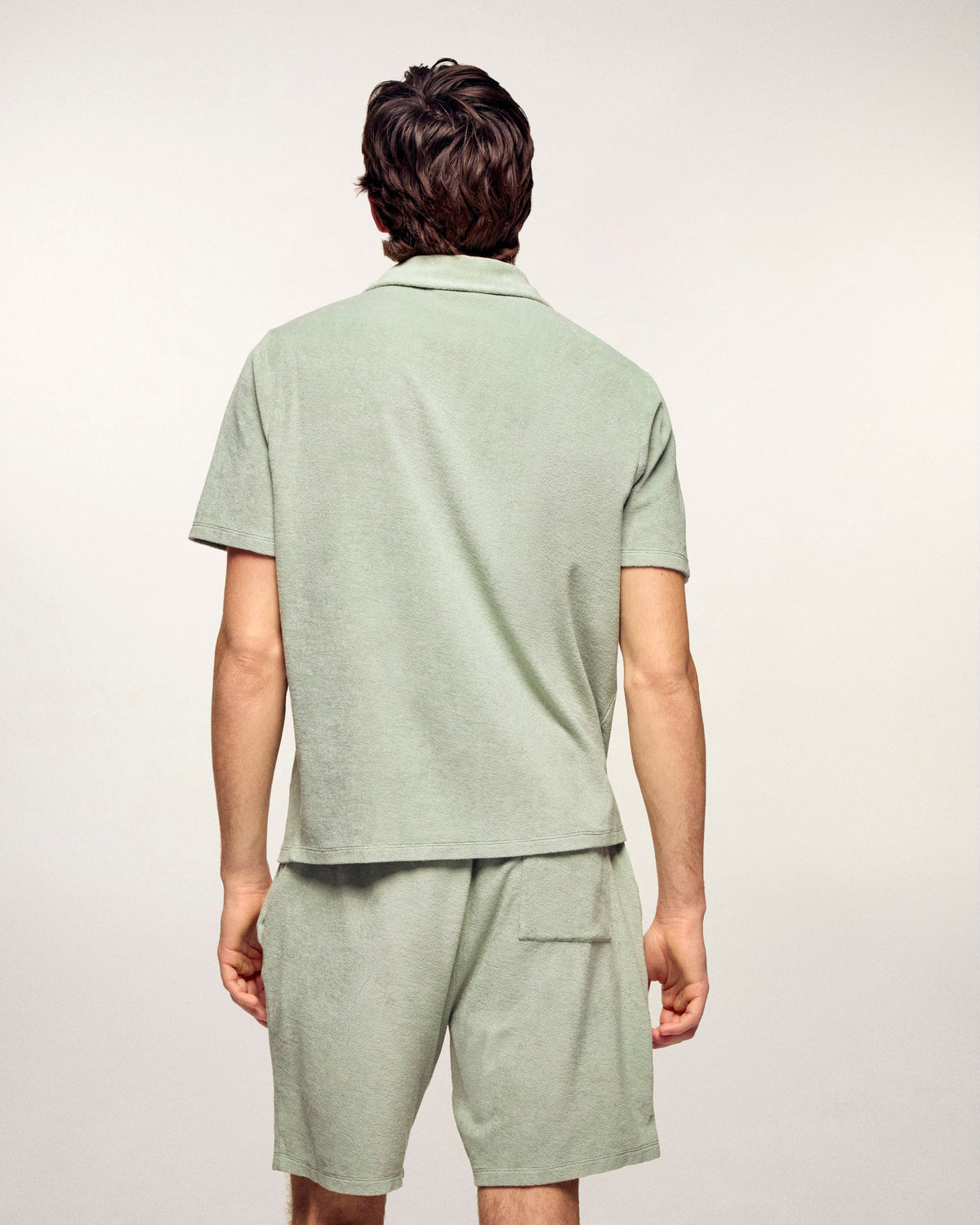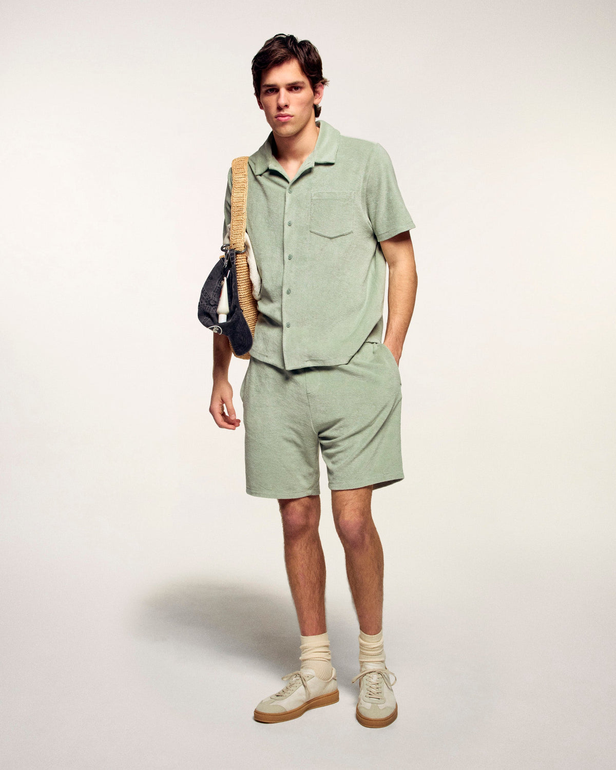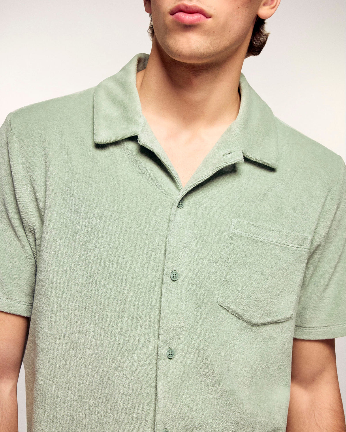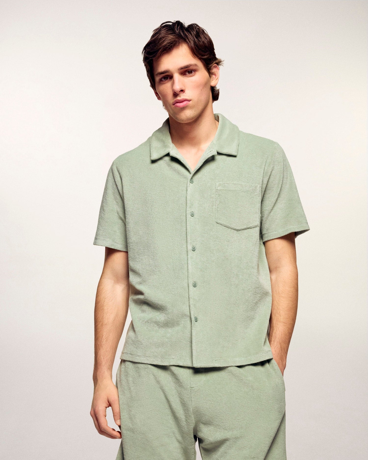 Cette chemise à manches courtes revisite un classique du vestiaire estival avec une texture originale et confortable. Confectionnée au Portugal dans une éponge de coton douce et absorbante, elle présente une coupe regular idéale pour une allure décontractée. Une pièce essentielle pour vos journées de détente ou pour parfaire un look de plage avec élégance.