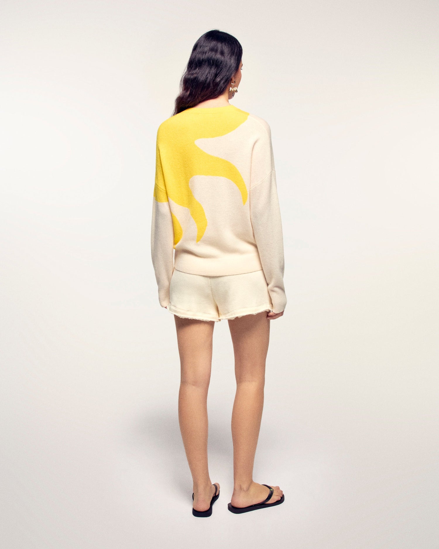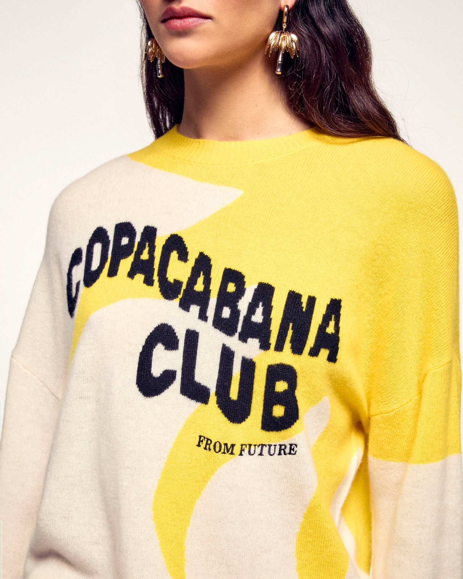 Confectionné dans un mélange de Laine et Cachemire 2 fils, ce pull col rond offre une maille douce et légère. Sa coupe regular intemporelle est dynamisée par un large motif central représentant le soleil et l'inscription "Copacabana Club" en intarsia, pour un look vacation-ready.