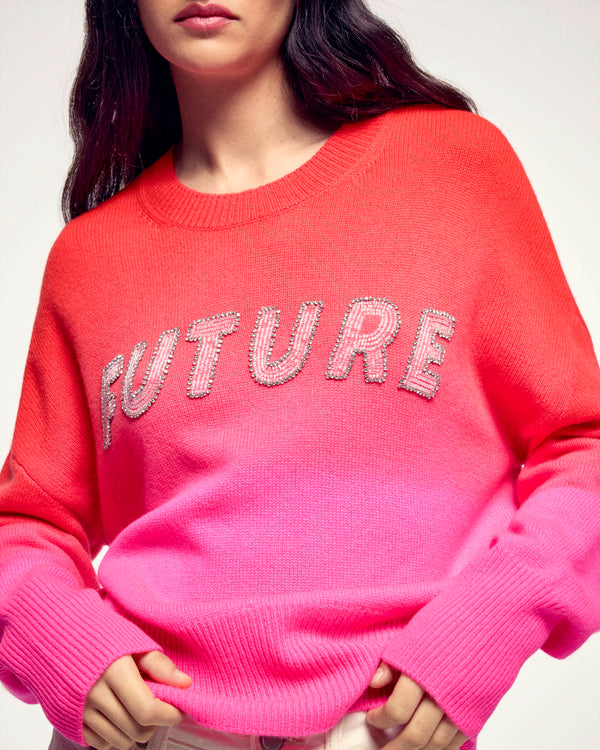 Le pull audacieux au design futuriste. Confectionné en Cachemire 4 fils, ce pull offre une maille douce et un tombé confortable. Sa coupe regular est twistée par un grand patch brodé du mot "FUTURE" avec des perles, ajoutant une touche scintillante et ultra-moderne.