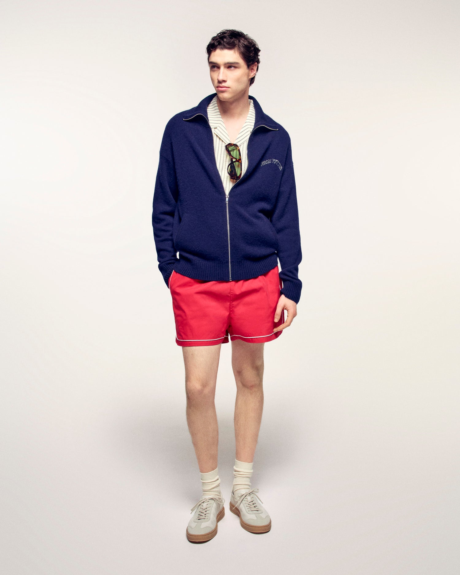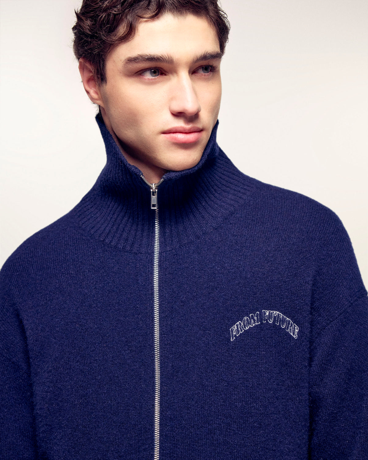 Ce gilet zippé est confectionné en pur cachemire, assurant une chaleur et une douceur exceptionnelles. Sa coupe classique et son col montant en font une pièce intemporelle, rehaussée par la broderie signature "FROM FUTURE".