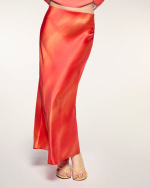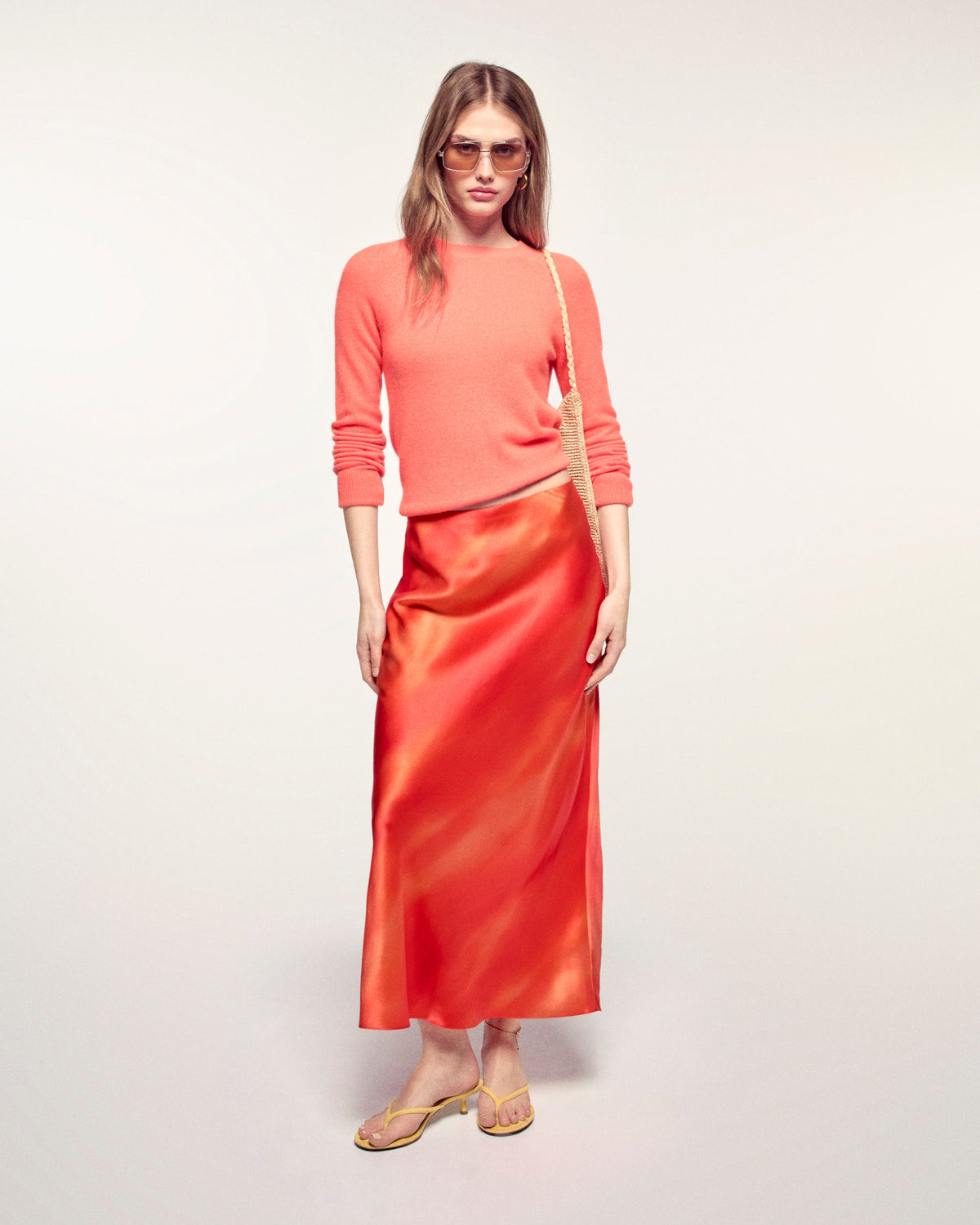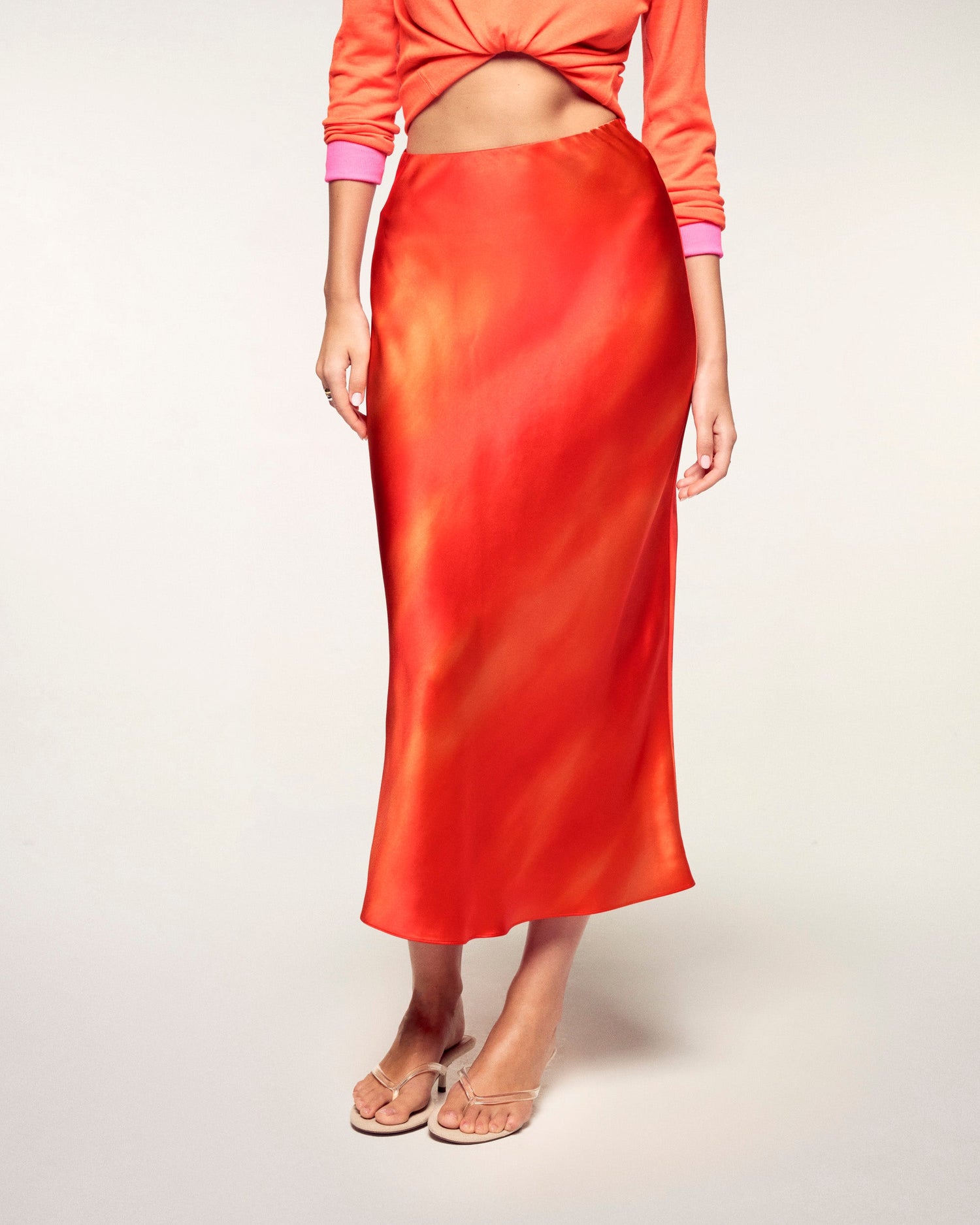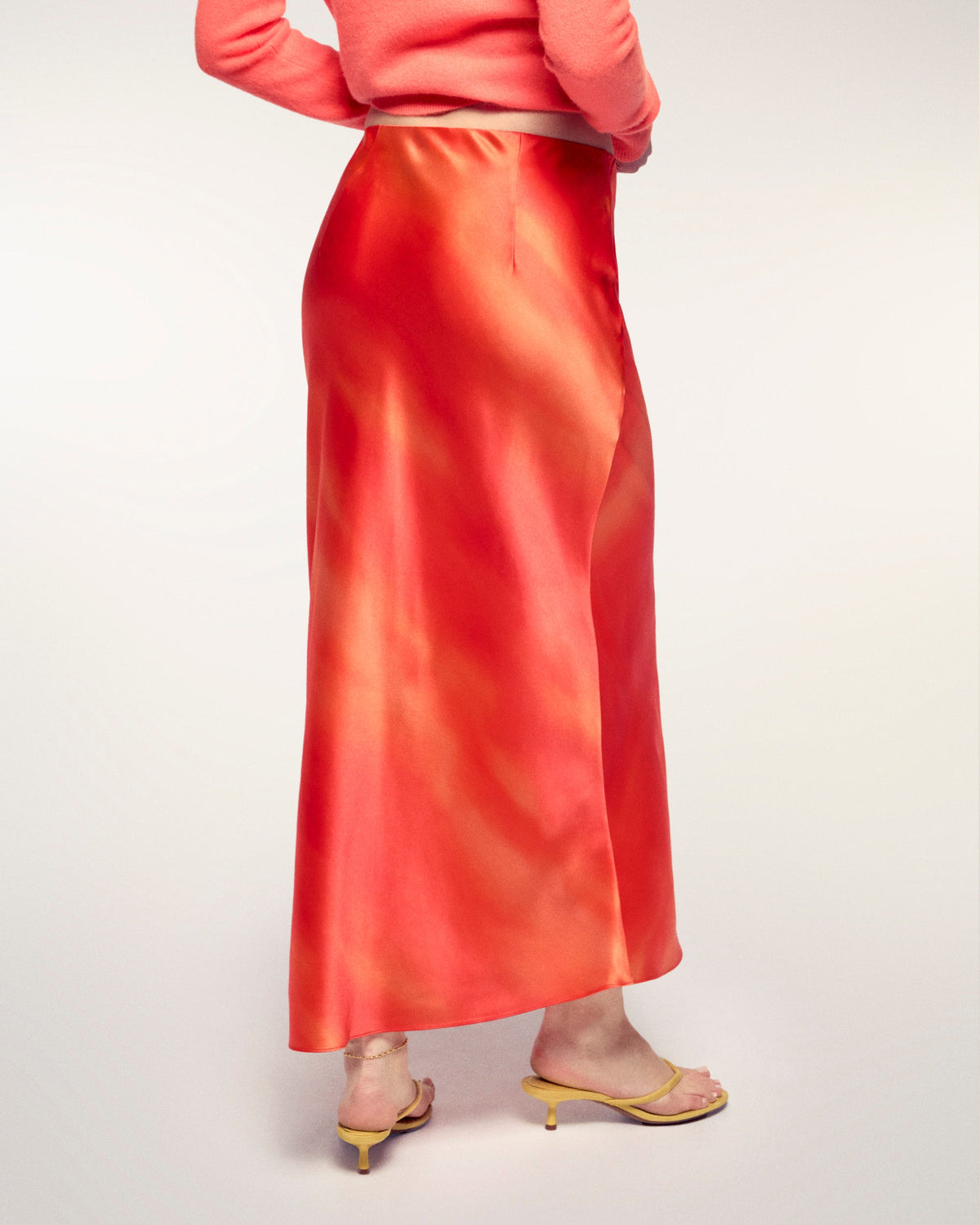 Confectionnée en satin de soie brillant et léger, la jupe mi-longue Vicky confère beaucoup d'allure. En toute élégance, elle dévoile un tombé fluide et évasé. Idéale en toutes circonstances, elle s'associe à un top structuré ou une chemise satinée.