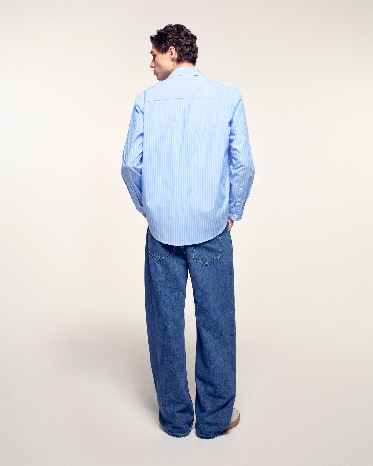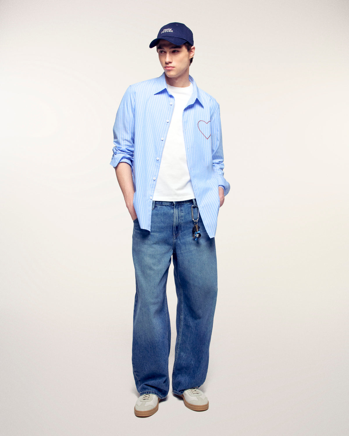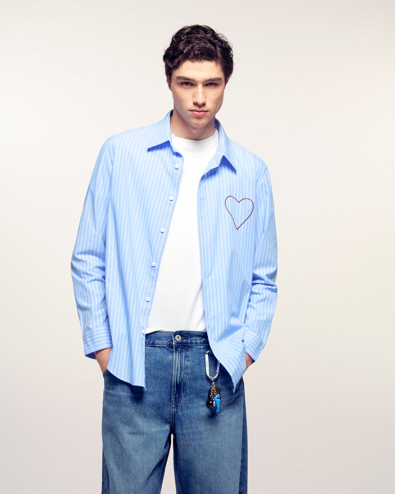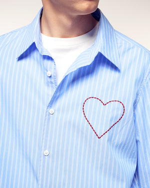 Cette chemise à rayures dévoile un cœur délicatement brodé et surpiqué sur la poitrine. Munie d'un col chemise et de manches longues, elle dévoile une fermeture et des poignets boutonnés pour une silhouette sophistiquée.