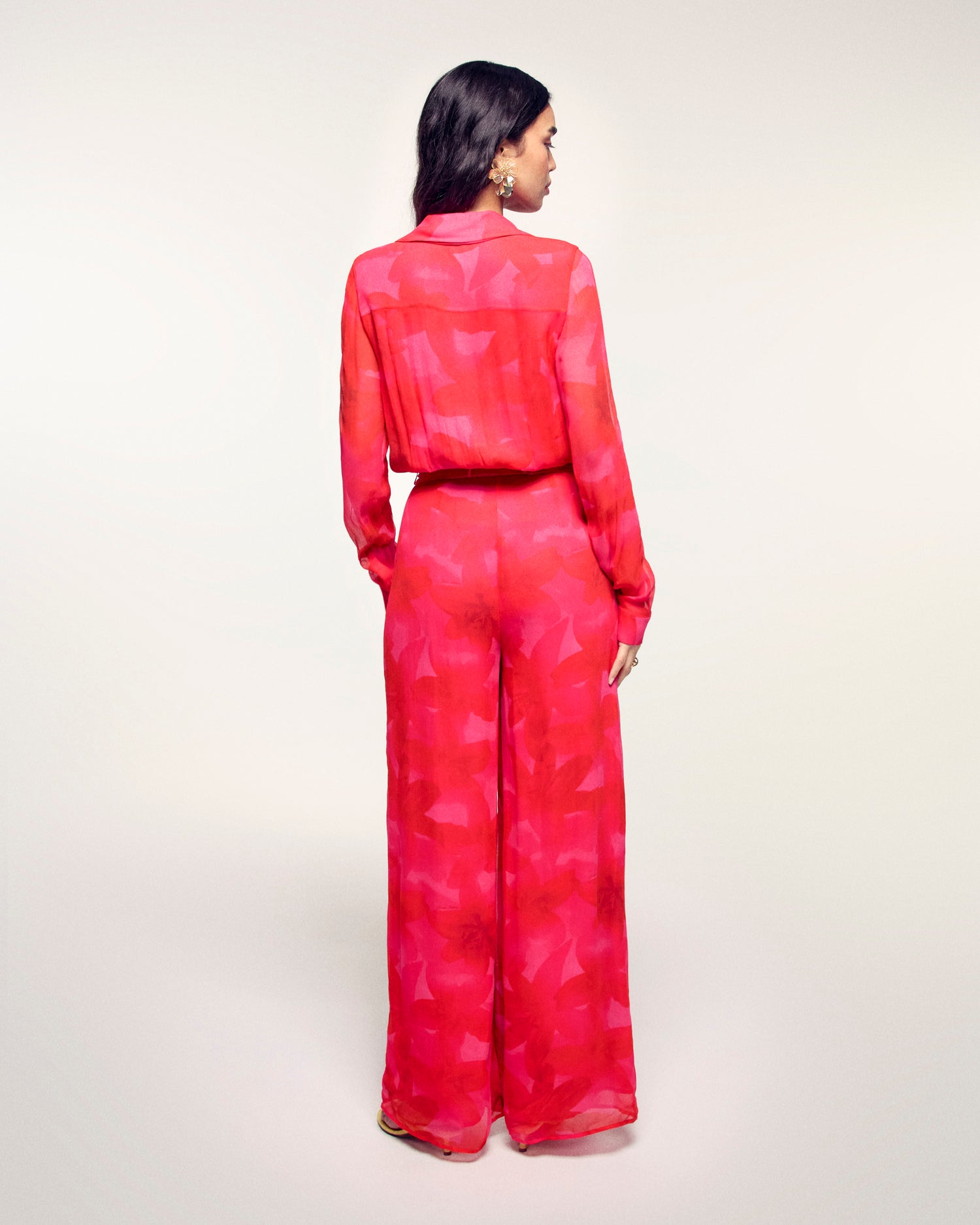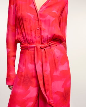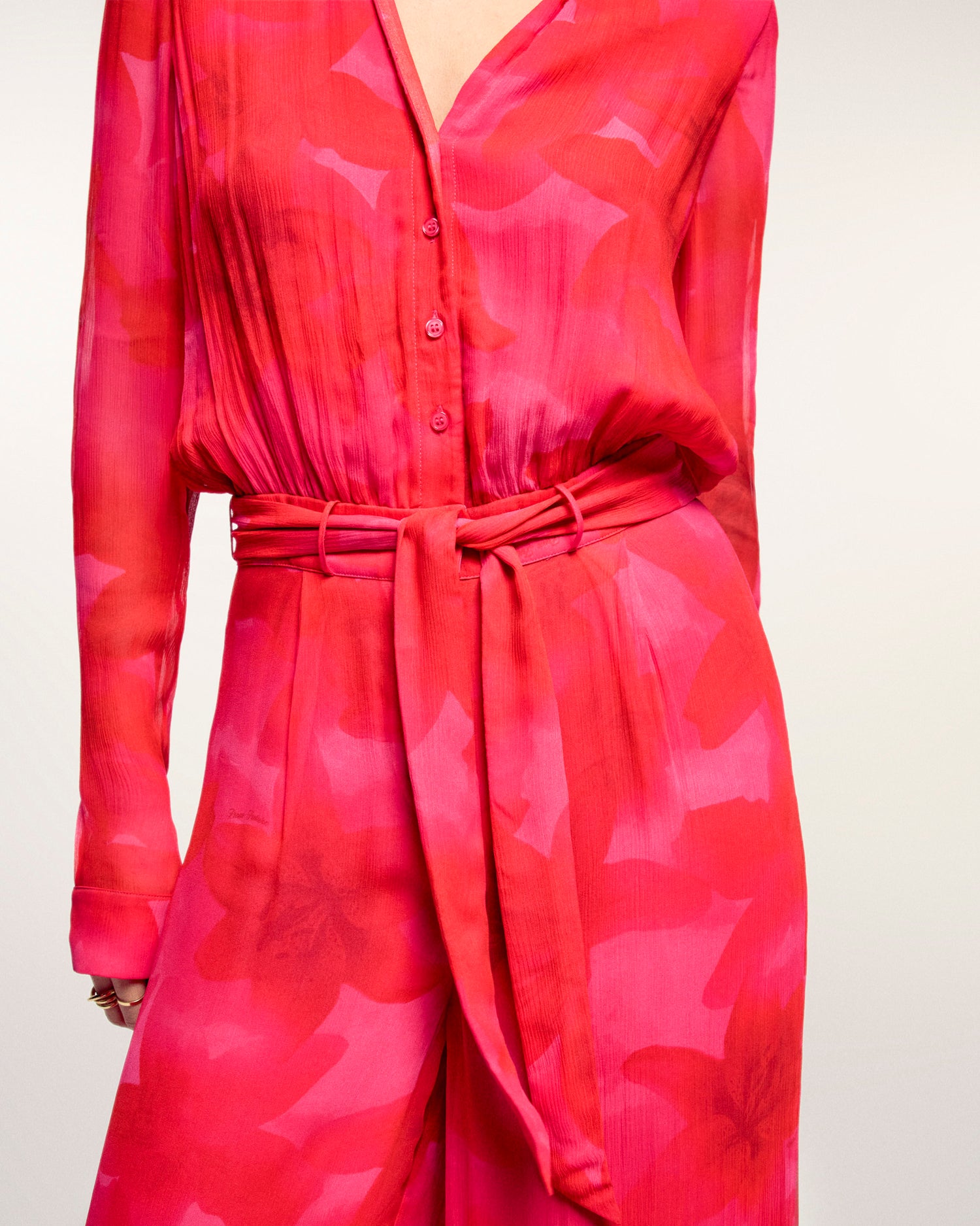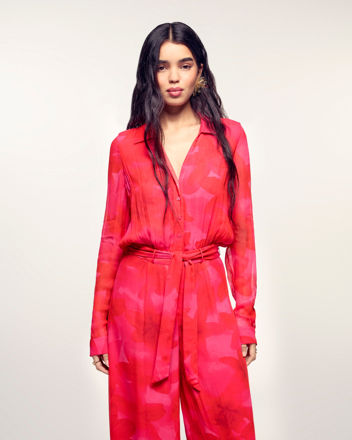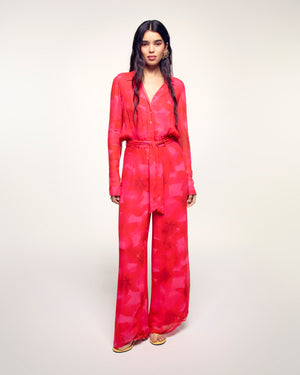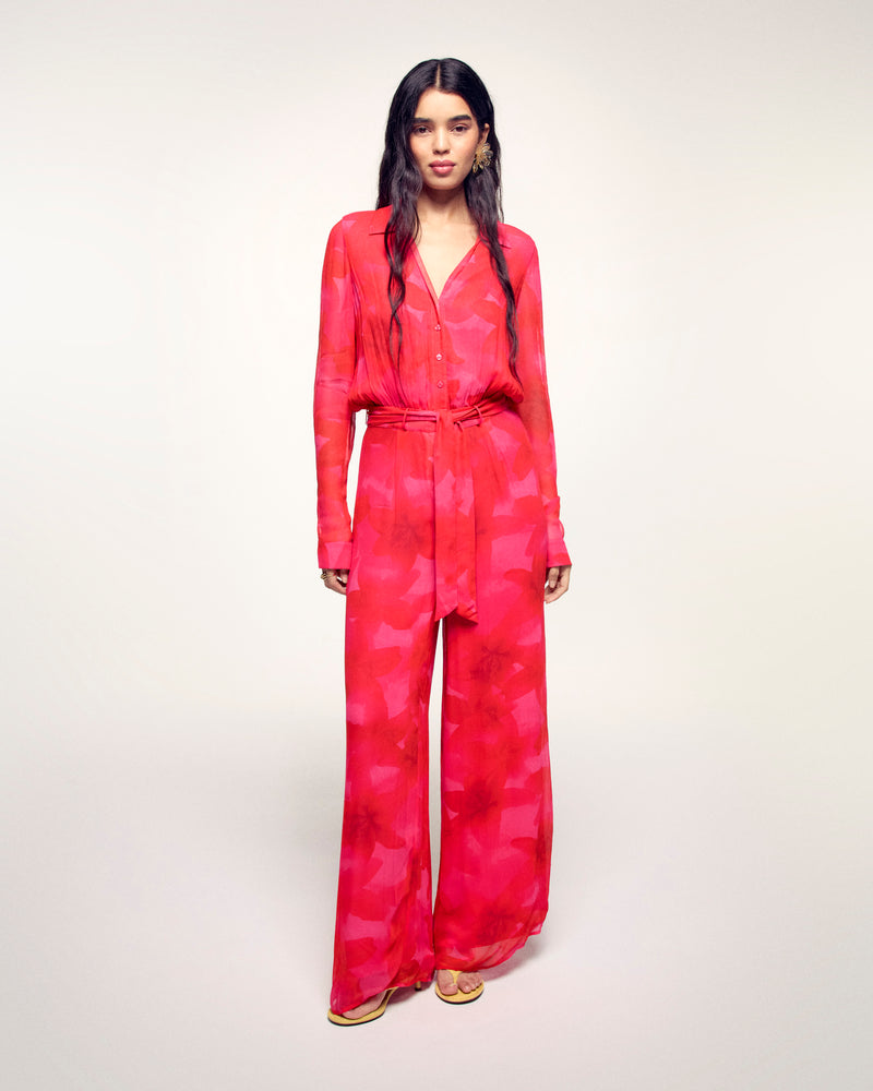 La pièce maîtresse de votre été. Confectionnée en Mousseline de Viscose, cette combinaison longue et fluide offre un confort absolu. Sa ceinture à nouer à la taille dessinent une silhouette élégante et décontractée.