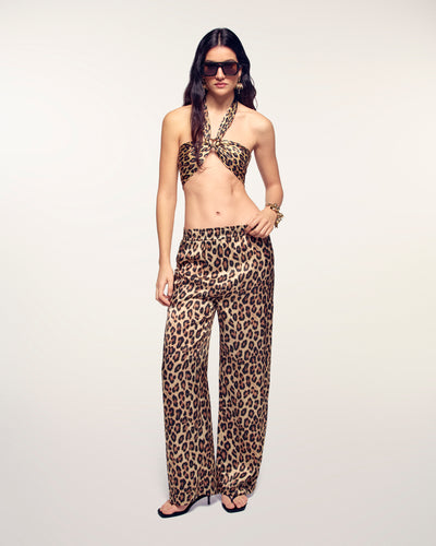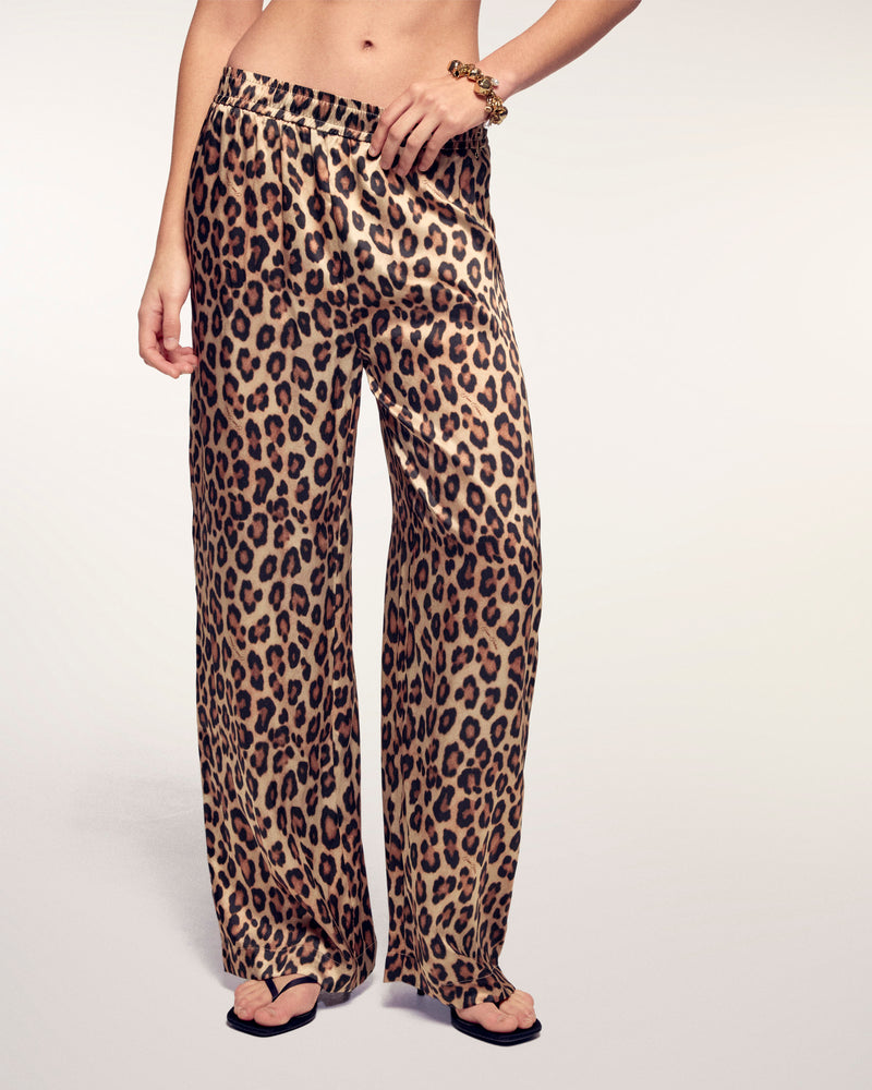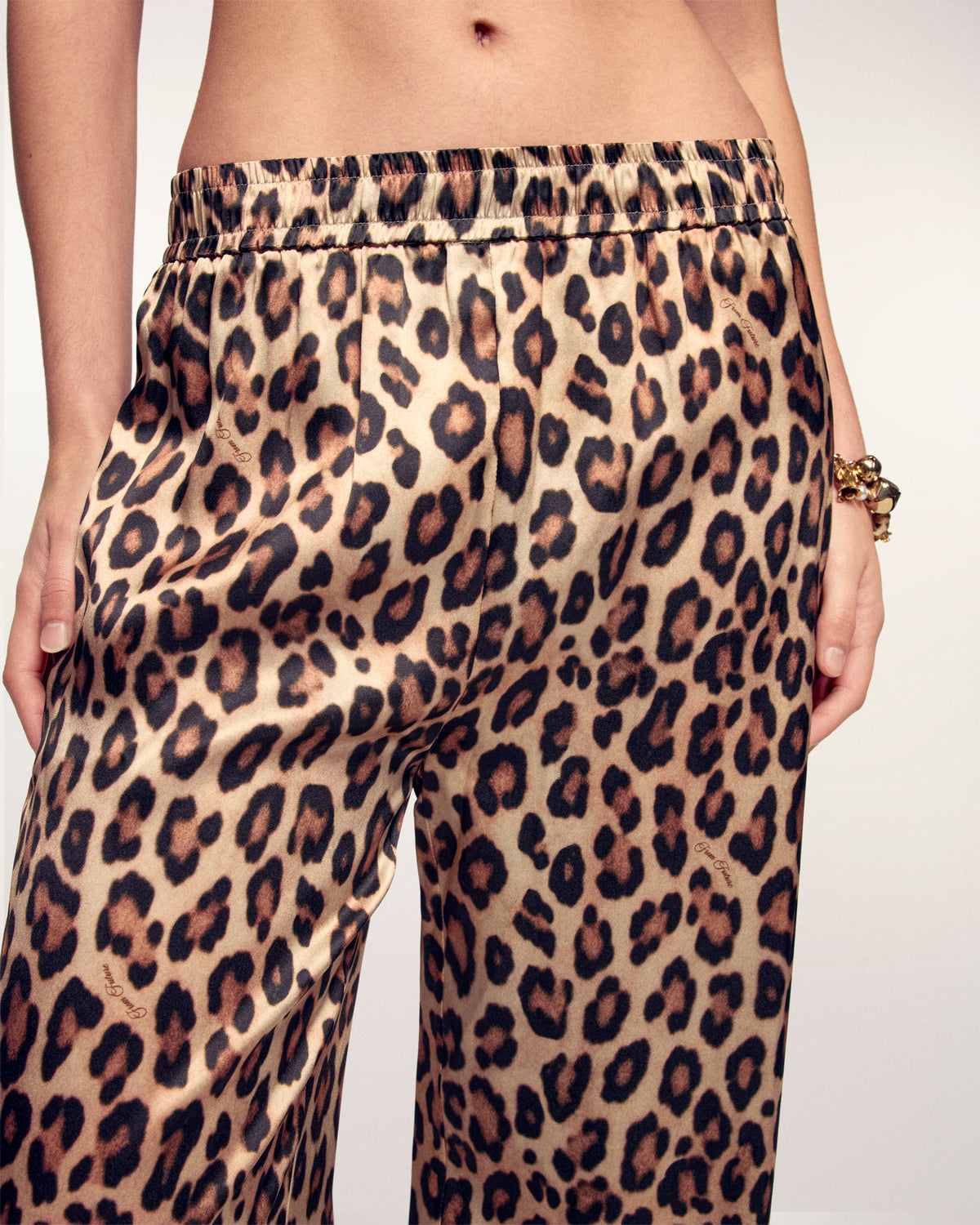 Confectionné en satin de soie brillant et soyeux, ce pantalon large se pare d’un imprimé léopard. Muni d'une taille élastiquée, il séduit par une coupe impeccable et un tombé fluide.