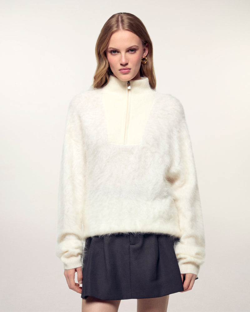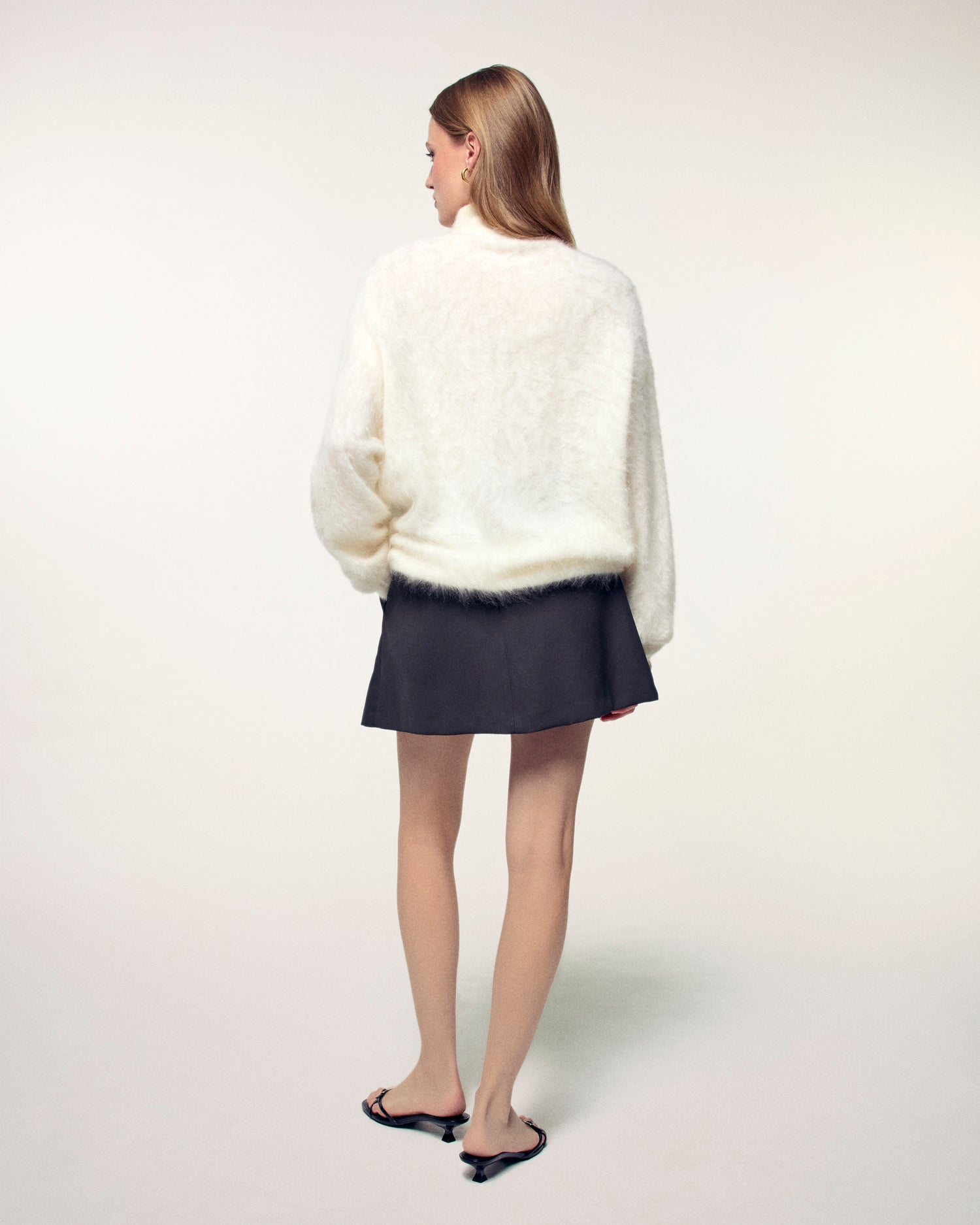 Un pull camionneur en cachemire à l’allure affirmée, mêlant volume cosy, toucher duveteux et détails côtelés contrastés.