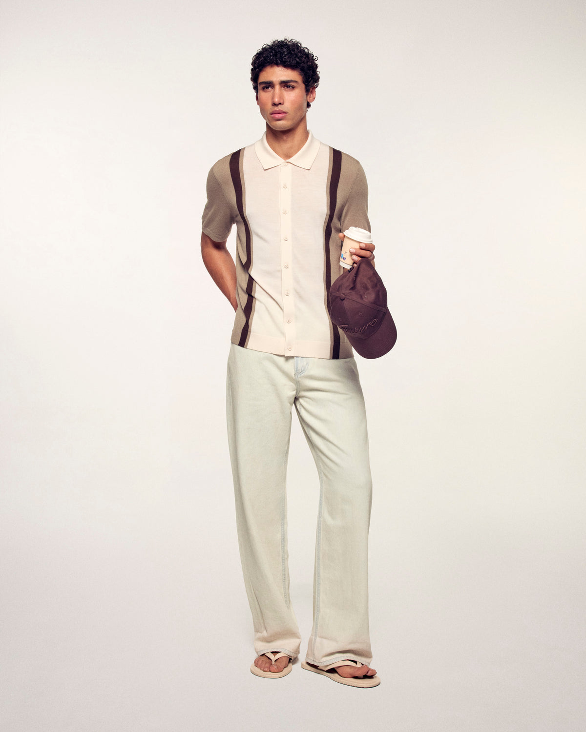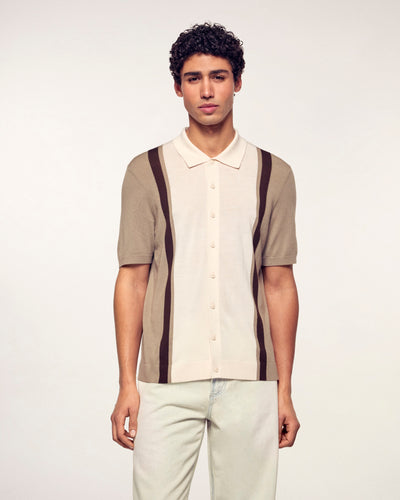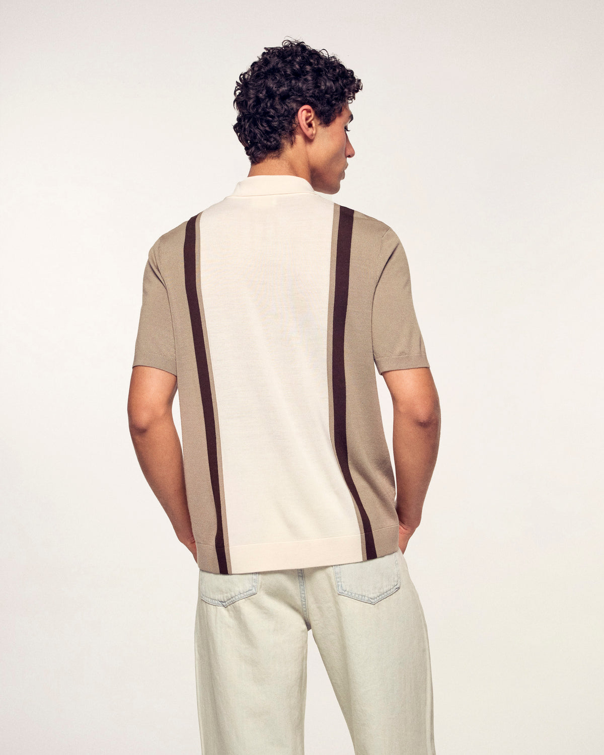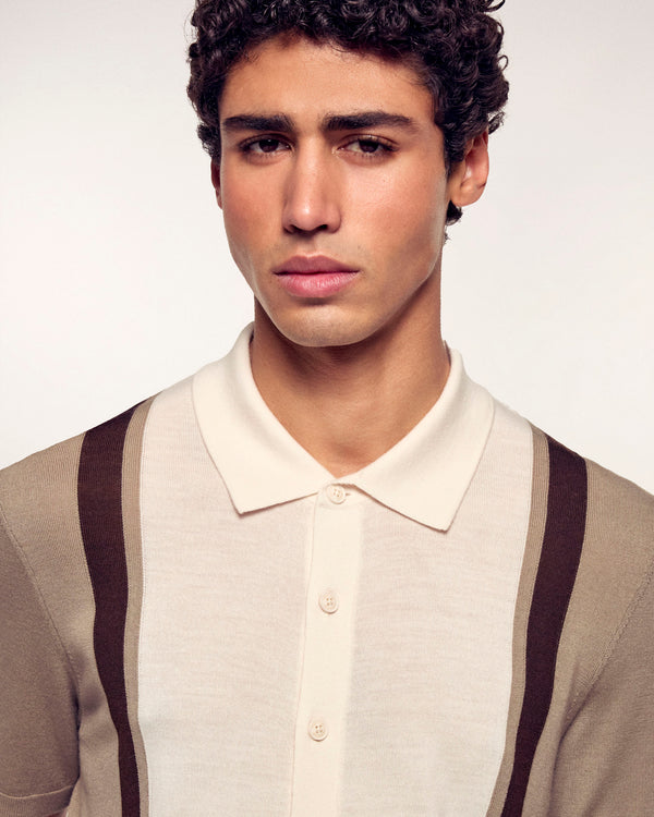 Une maille fine et élégante pour ce pull col polo confectionné en laine mérinos. Il se distingue par son jeu de bandes contrastées verticales qui structurent la silhouette pour un style graphique et intemporel.