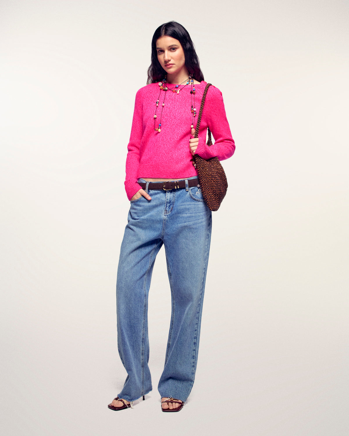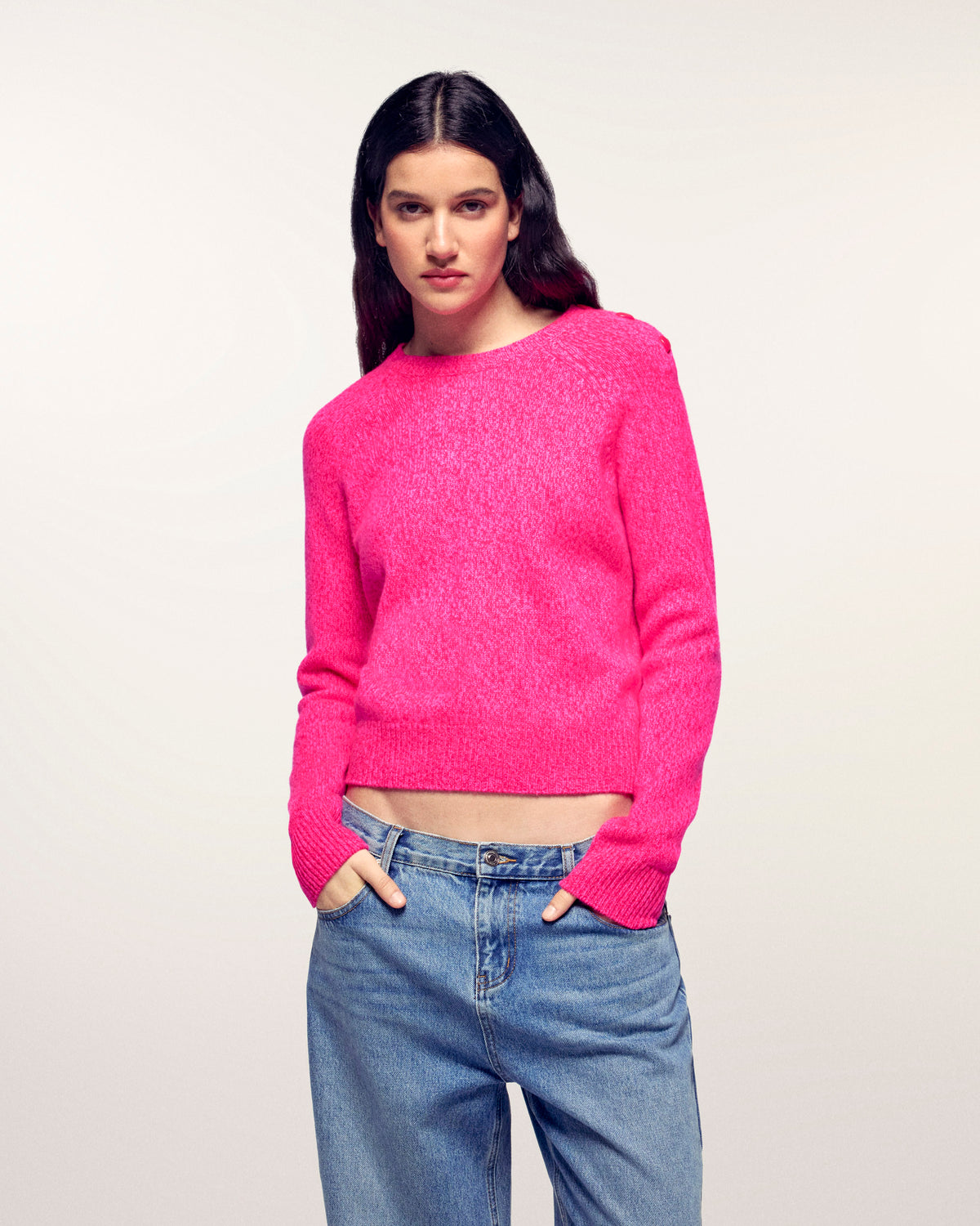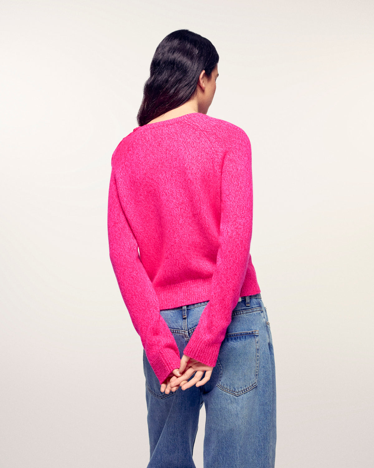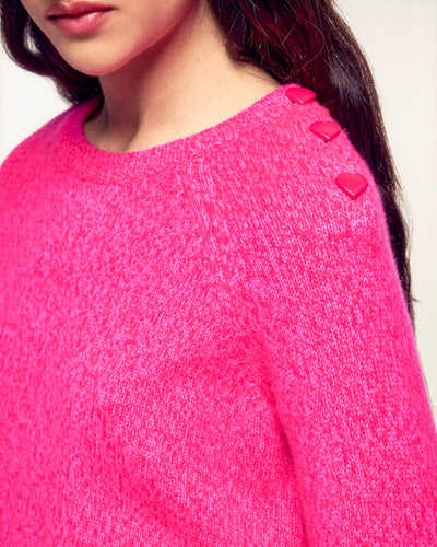 Une pièce chaleureuse au fini chiné, idéale pour apporter une touche de douceur et de fantaisie à votre quotidien. Ce pull se distingue par ses boutons en forme de cœur sur l'ouverture à l'épaule, offrant une silhouette à la fois moderne et romantique.