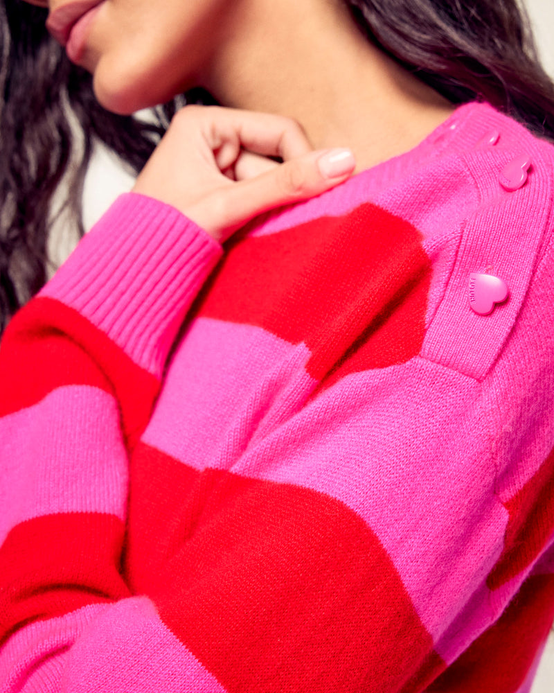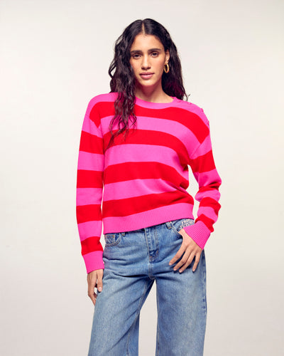 Une pièce au charme romantique et graphique, idéale pour illuminer votre vestiaire de saison. Ce pull en cachemire se distingue par ses rayures bicolores vibrantes et ses boutons dorés en forme de cœur sur l'épaule, offrant une allure à la fois douce et audacieuse.