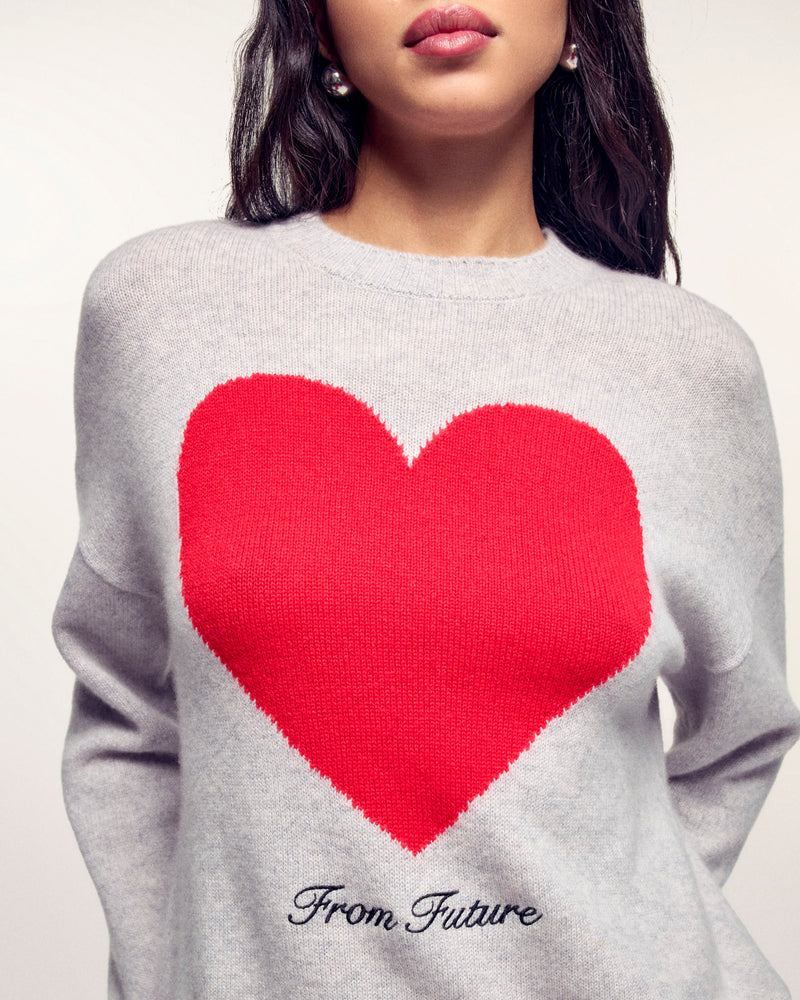 Confectionné en Cachemire 4 fils, ce pull offre une maille dense et douce. Sa coupe regular intemporelle est dynamisée par un grand motif cœur réalisé en intarsia, avec le texte "Future" brodé au centre.