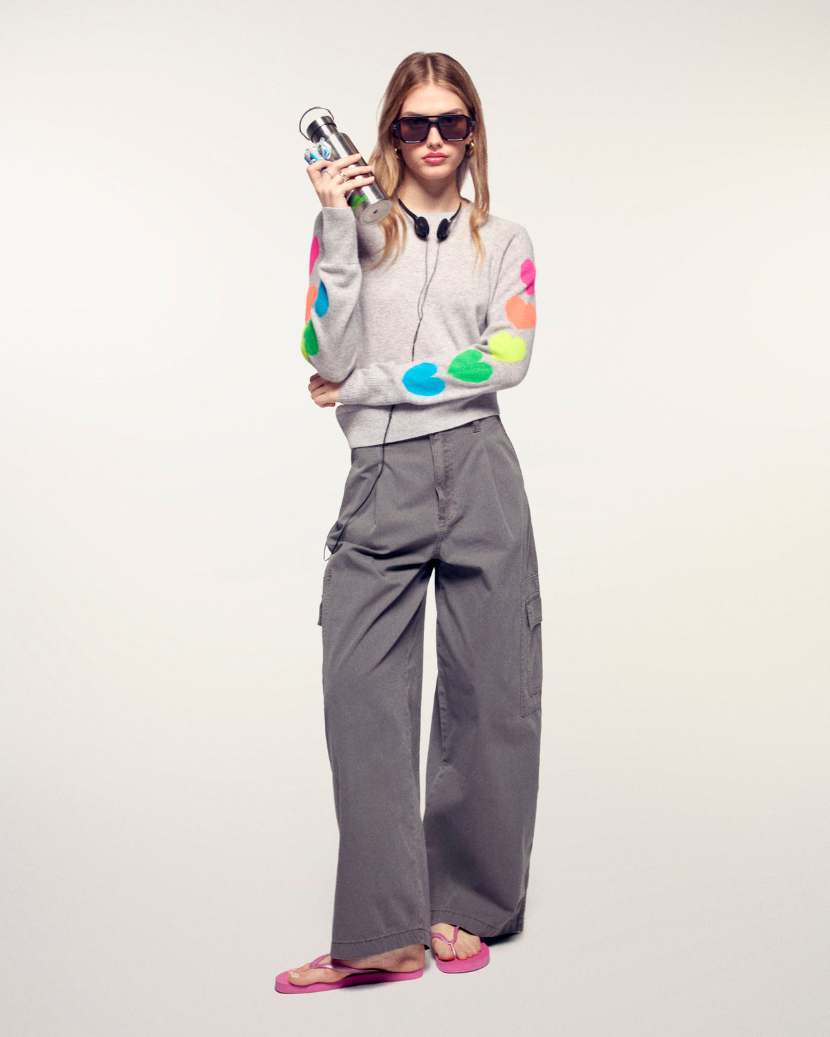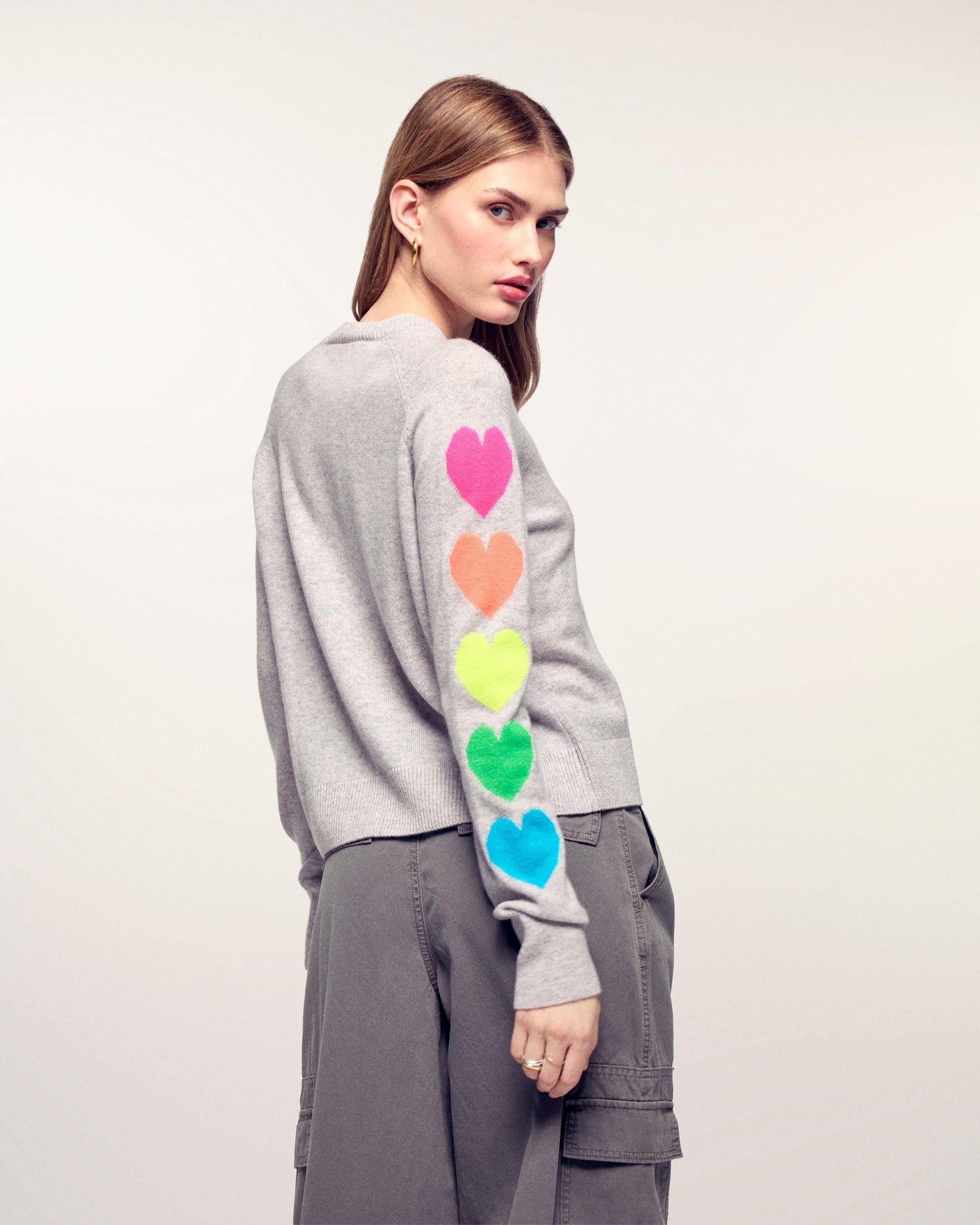 Une pièce à la fois douce et ludique qui apporte une touche de gaieté à votre vestiaire. Ce pull en cachemire léger se distingue par sa série de motifs cœurs multicolores sur le long des manches, offrant une silhouette moderne et pleine de fantaisie.