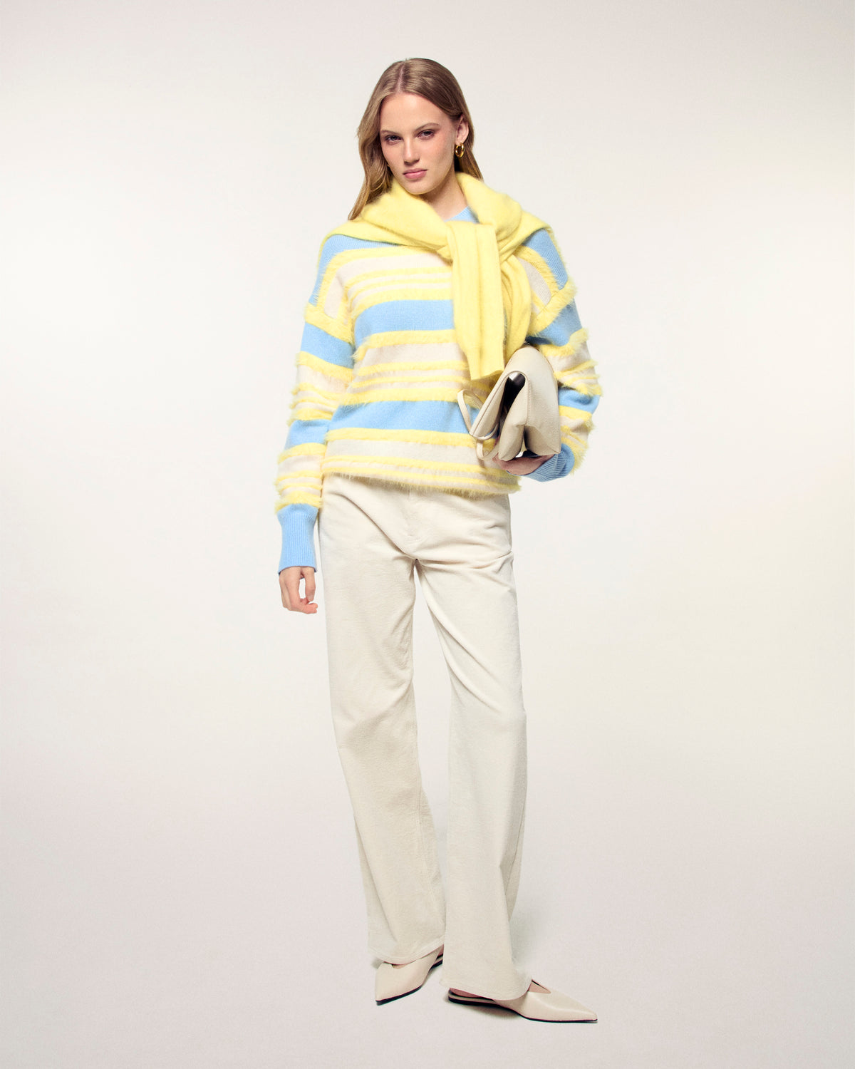 Un pull vibrant en maille rayée, mêlant couleurs intenses, texture cachemire brossé et volume enveloppant pour une allure pleine d’énergie.