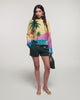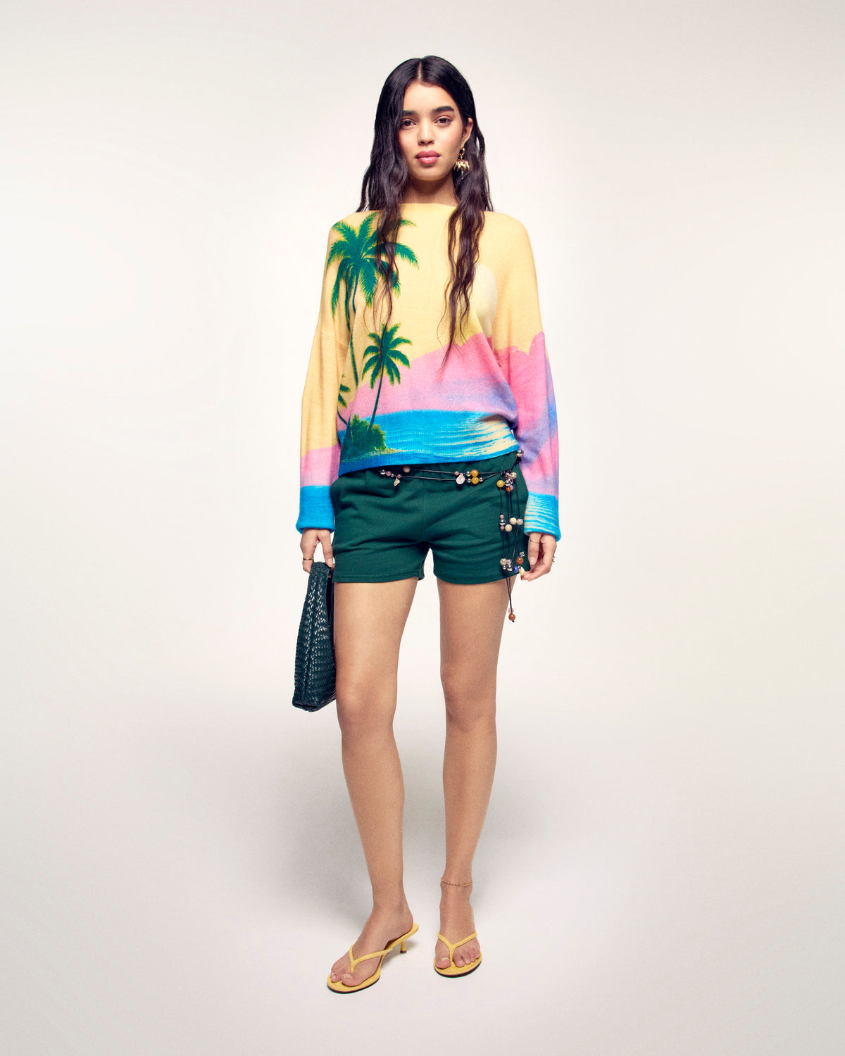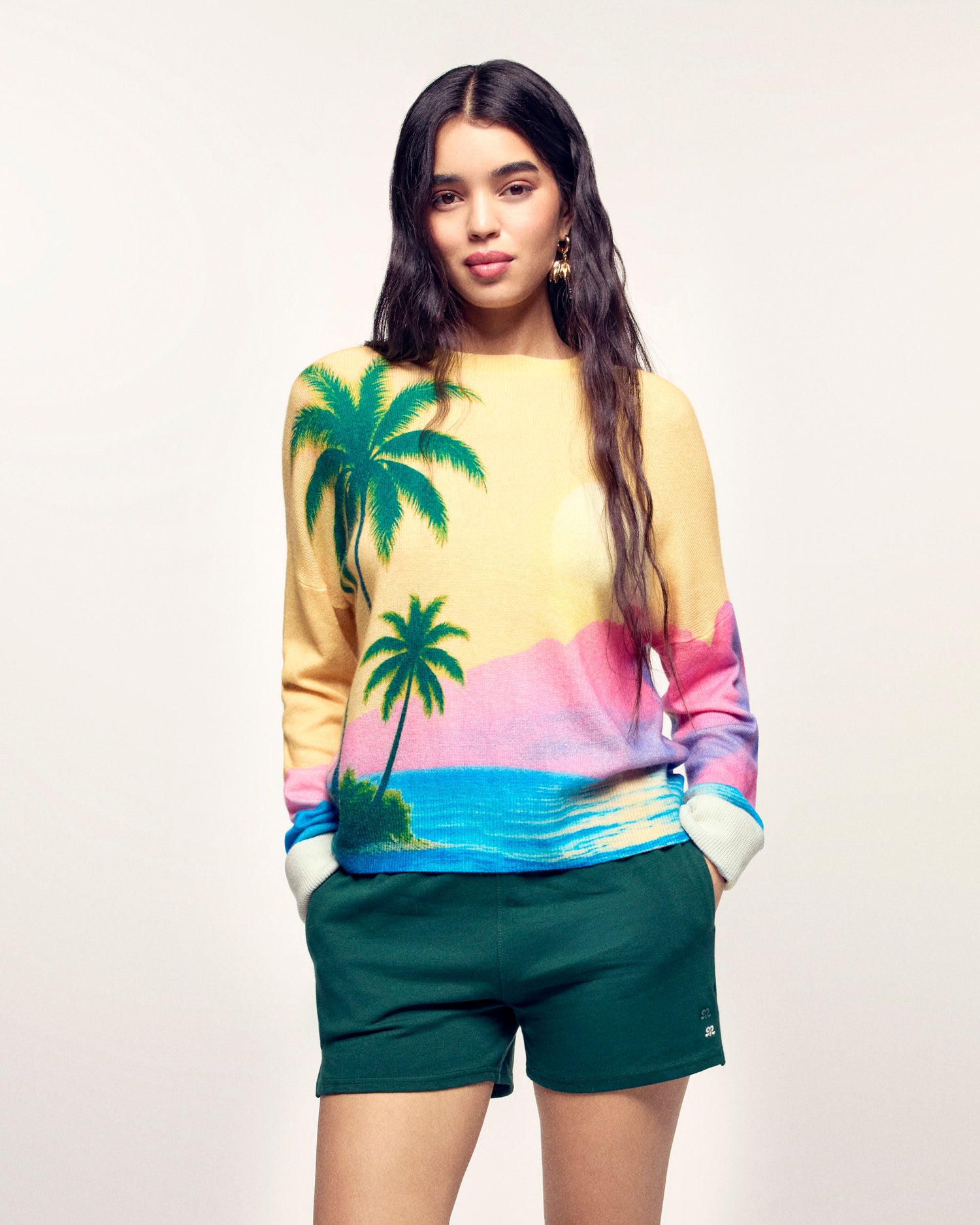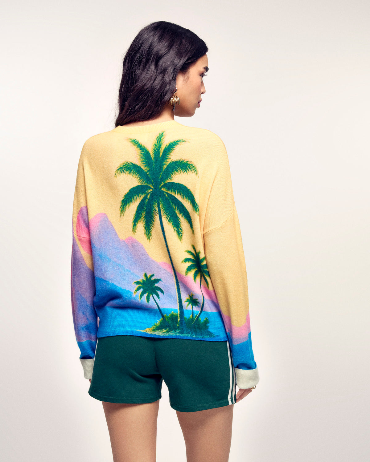 Le pull qui vous transporte directement sous les tropiques. Confectionné en Cachemire 2 fils, ce pull col rond offre une maille douce et légère. Sa coupe oversize est mise en valeur par un imprimé intégral vibrant représentant un coucher de soleil et des palmiers.
