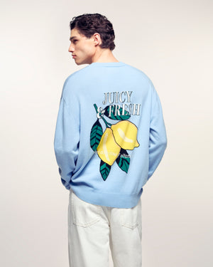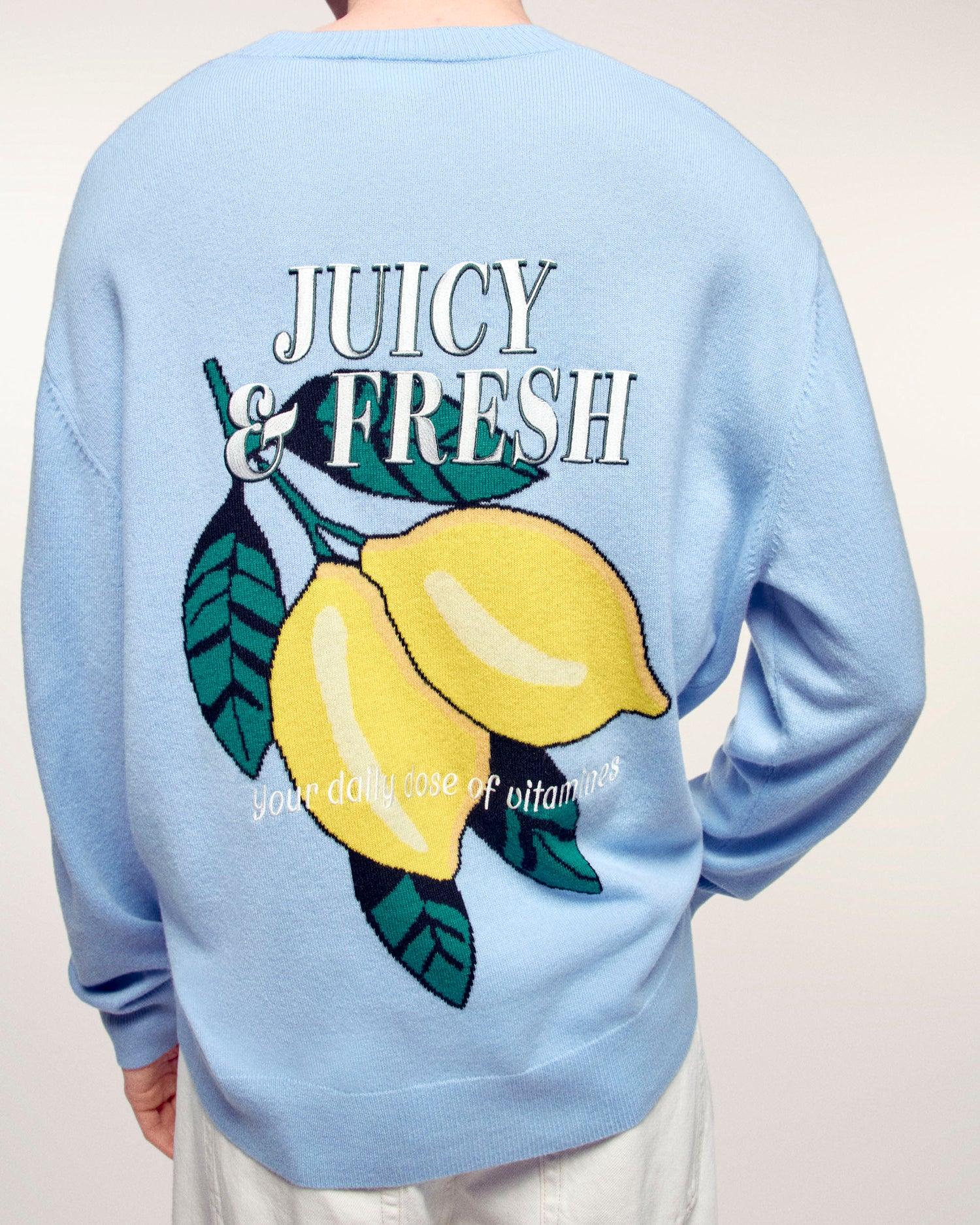 Votre dose quotidienne de bonne humeur. Confectionné en Cachemire 2 fils, ce pull offre un confort exceptionnel. Sa coupe regular intemporelle est twistée par un grand motif en intarsia au dos, représentant des citrons avec le message "Juicy & Fresh your daily dose of vitamine".
