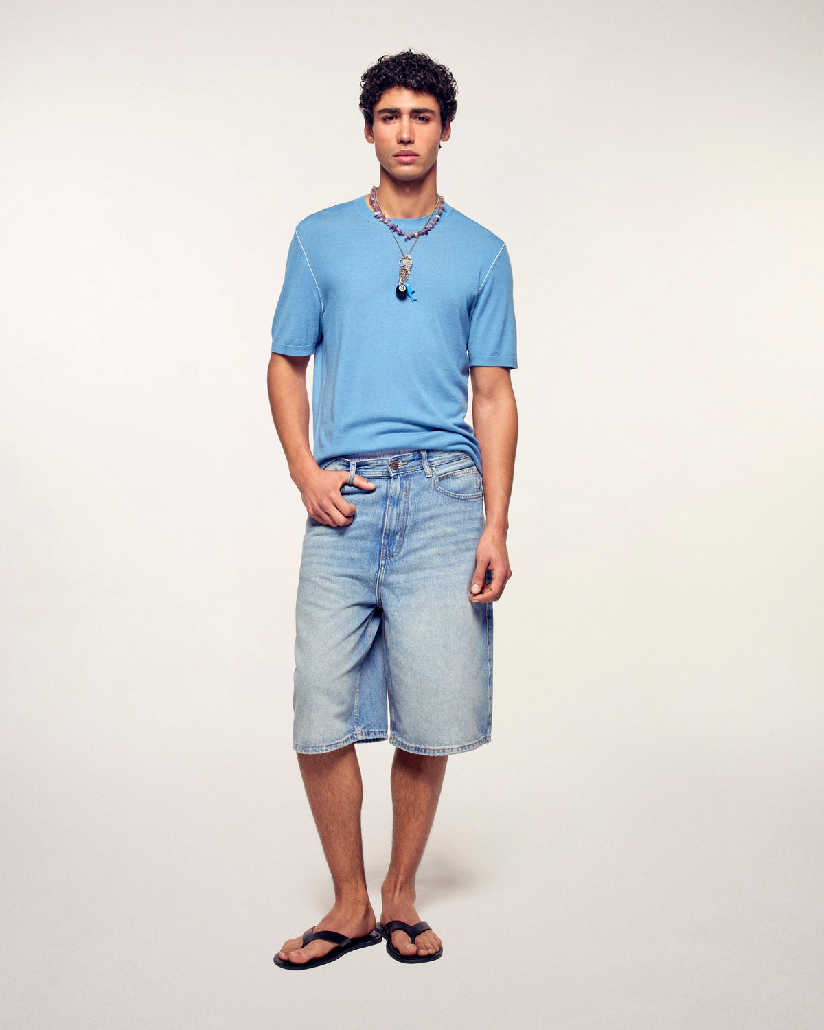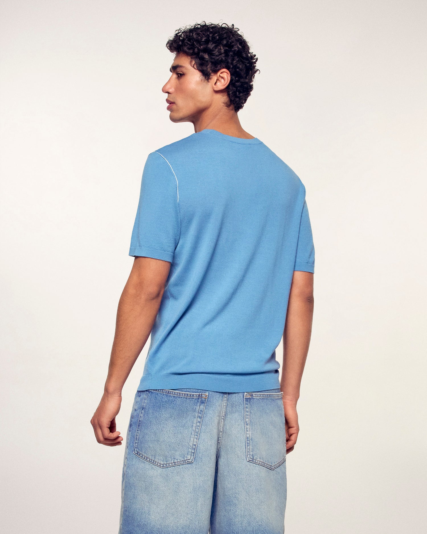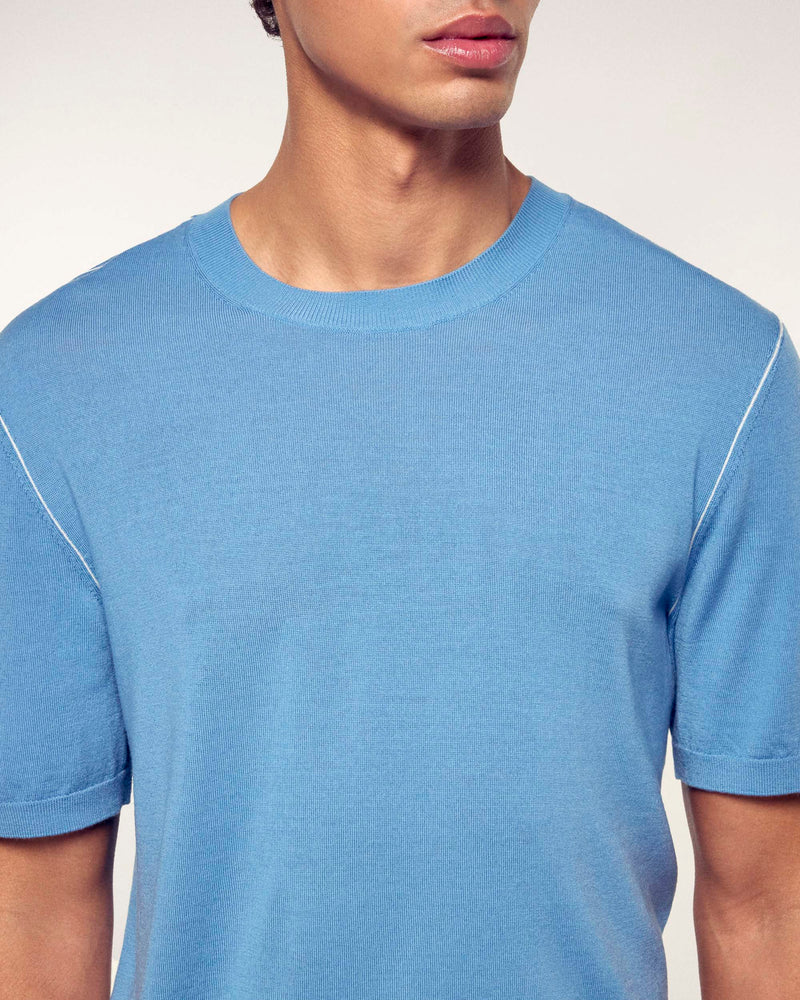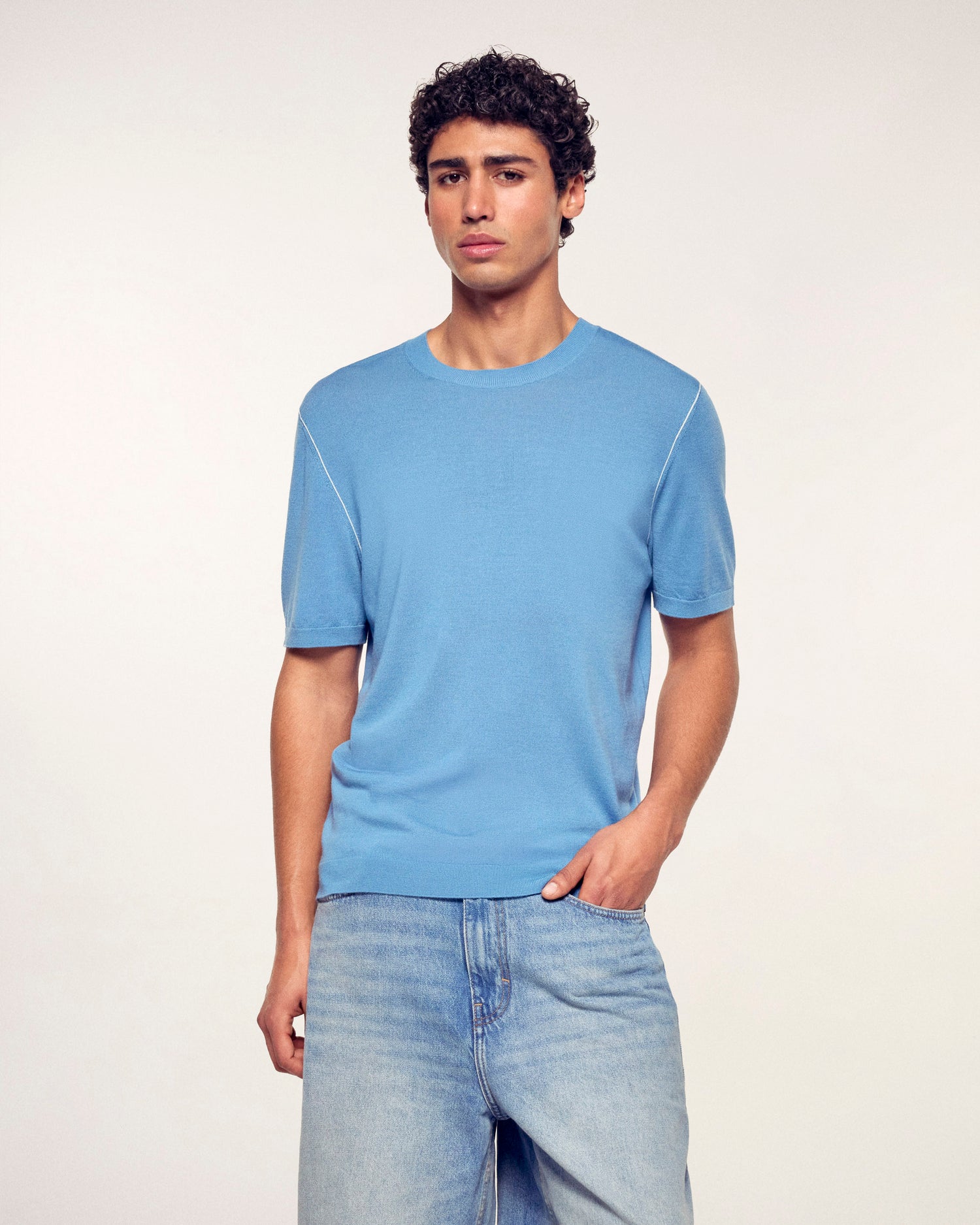 Une pièce minimaliste et élégante, confectionnée en laine mérinos pour une légèreté absolue. Ce pull à manches courtes se distingue par ses fins liserés contrastés qui soulignent délicatement la silhouette pour un style moderne et raffiné.