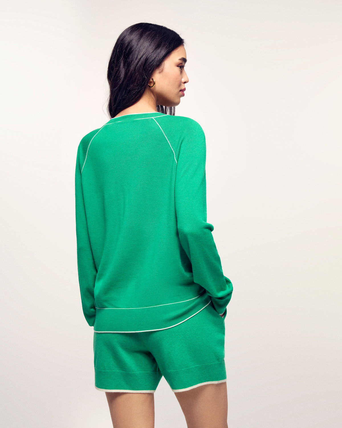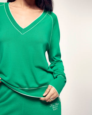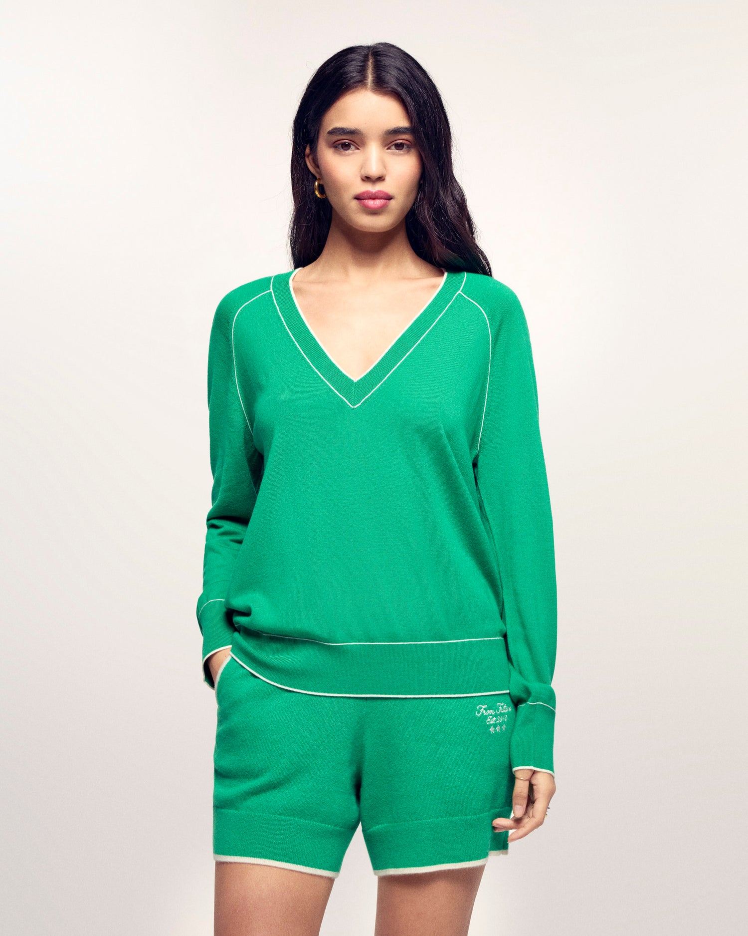 Le pull à col V qui sublime votre tenue. Confectionné en Laine Mérinos Extrafine 2 fils, ce pull offre une maille douce et légère. Sa coupe regular intemporelle est dynamisée par des liserés contrastés qui encadrent le col, soulignent les emmanchures raglan et finissent les bords-côtes.