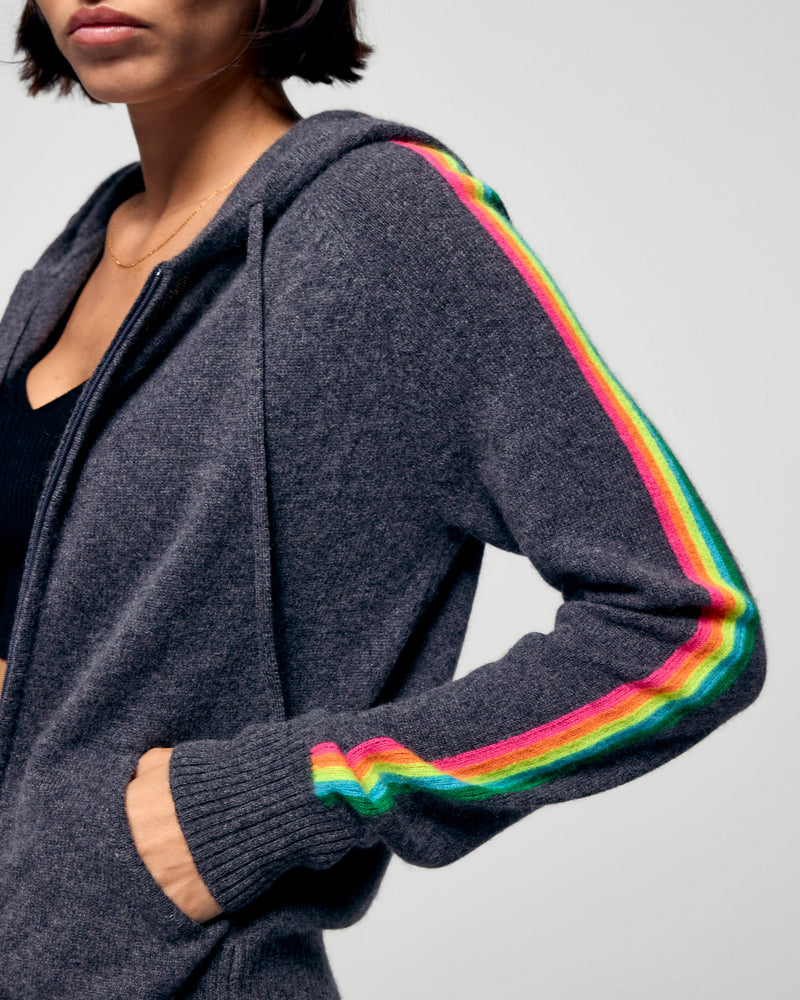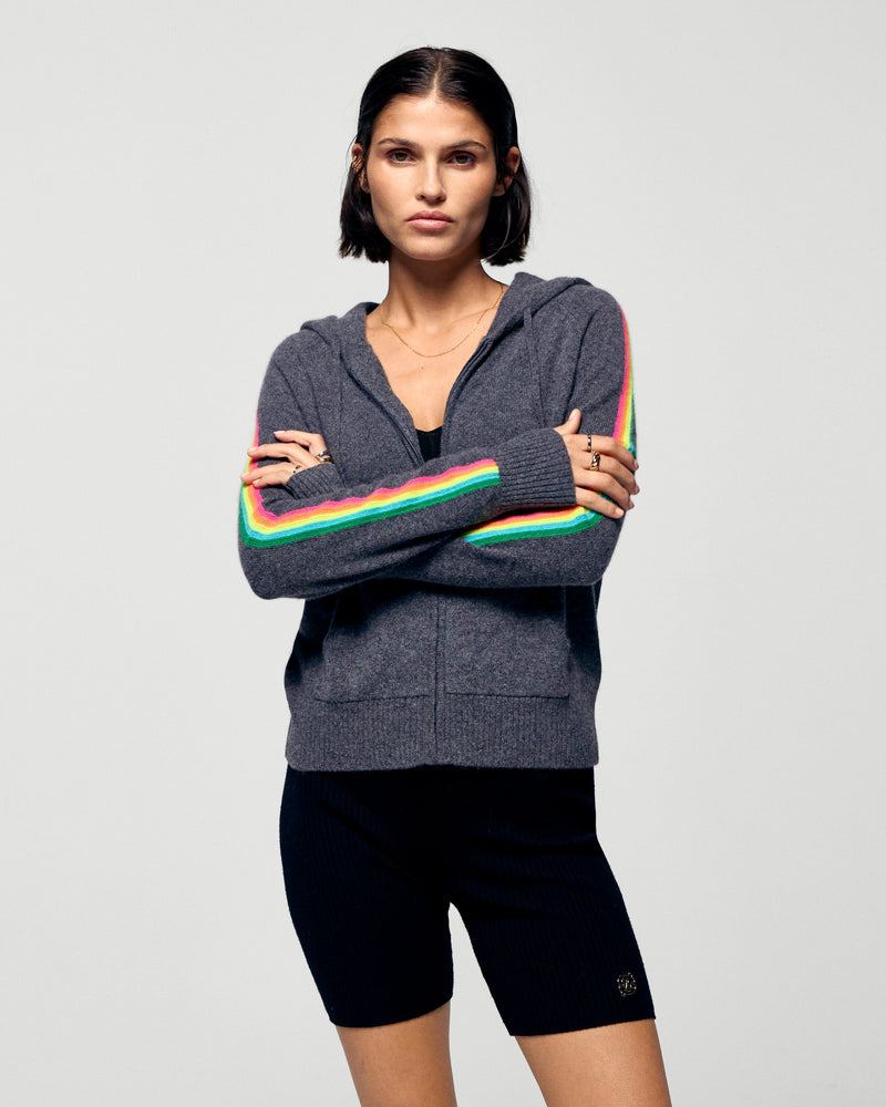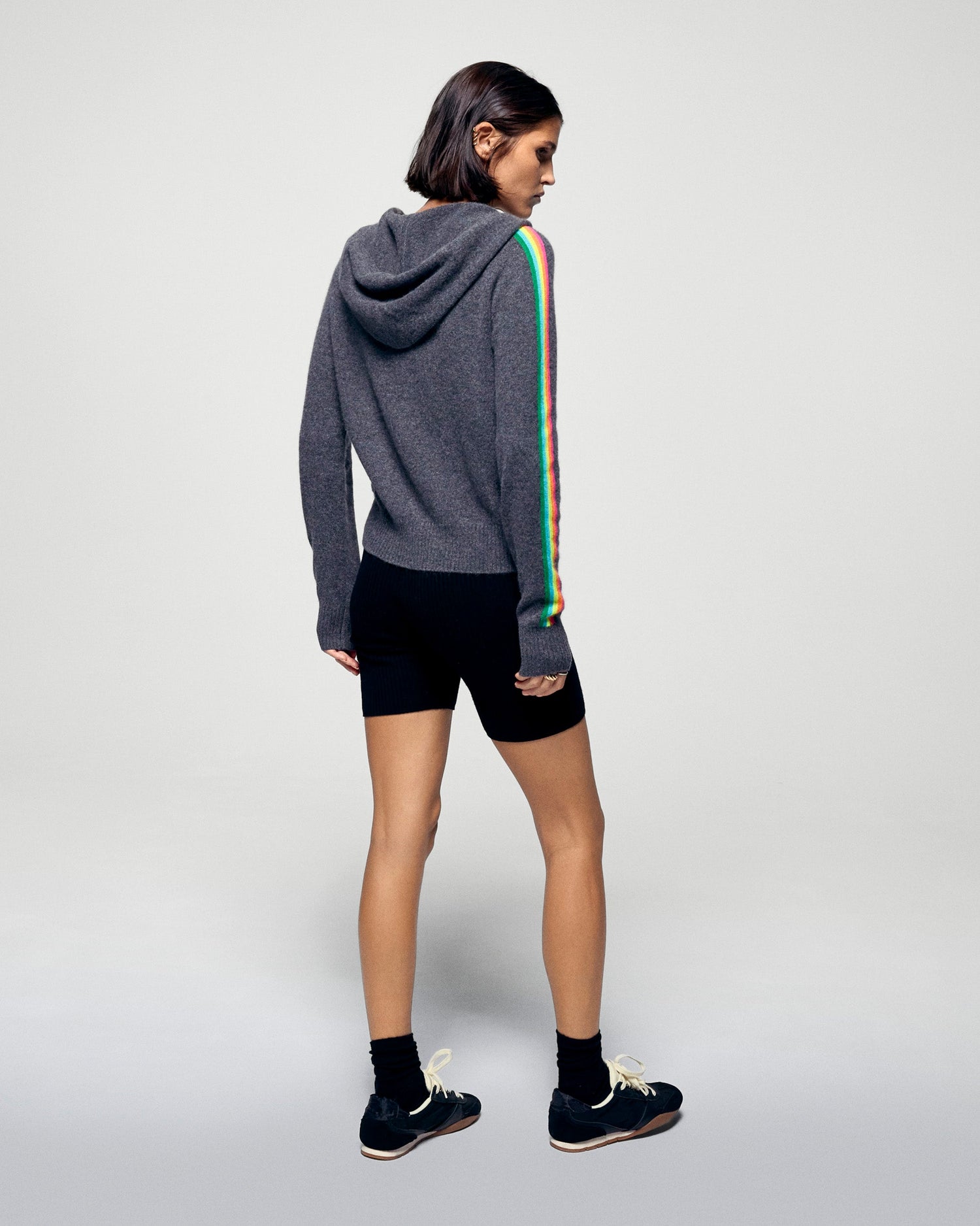 Pièce iconique du vestiaire From Future, ce pull hoodie court se pare de bandes multicolores le long des manches pour réveiller votre silhouette de saison. Confectionné en cachemire doux et léger, il dévoile une capuche à cordons, une fermeture zippée et une poche avant.