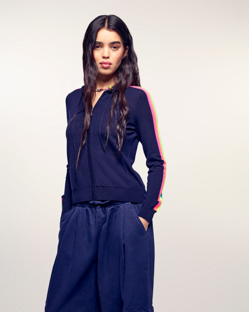 Une maille douce et moelleuse pour ce pull hoodie confectionné en laine mérinos 2 fils. Muni d'une capuche et d'une fermeture zippée, des bandes multicolores s'invitent le long des manches, signatures de l'allure From Future. Complétez votre look avec un jean ample ou un pantalon droit.