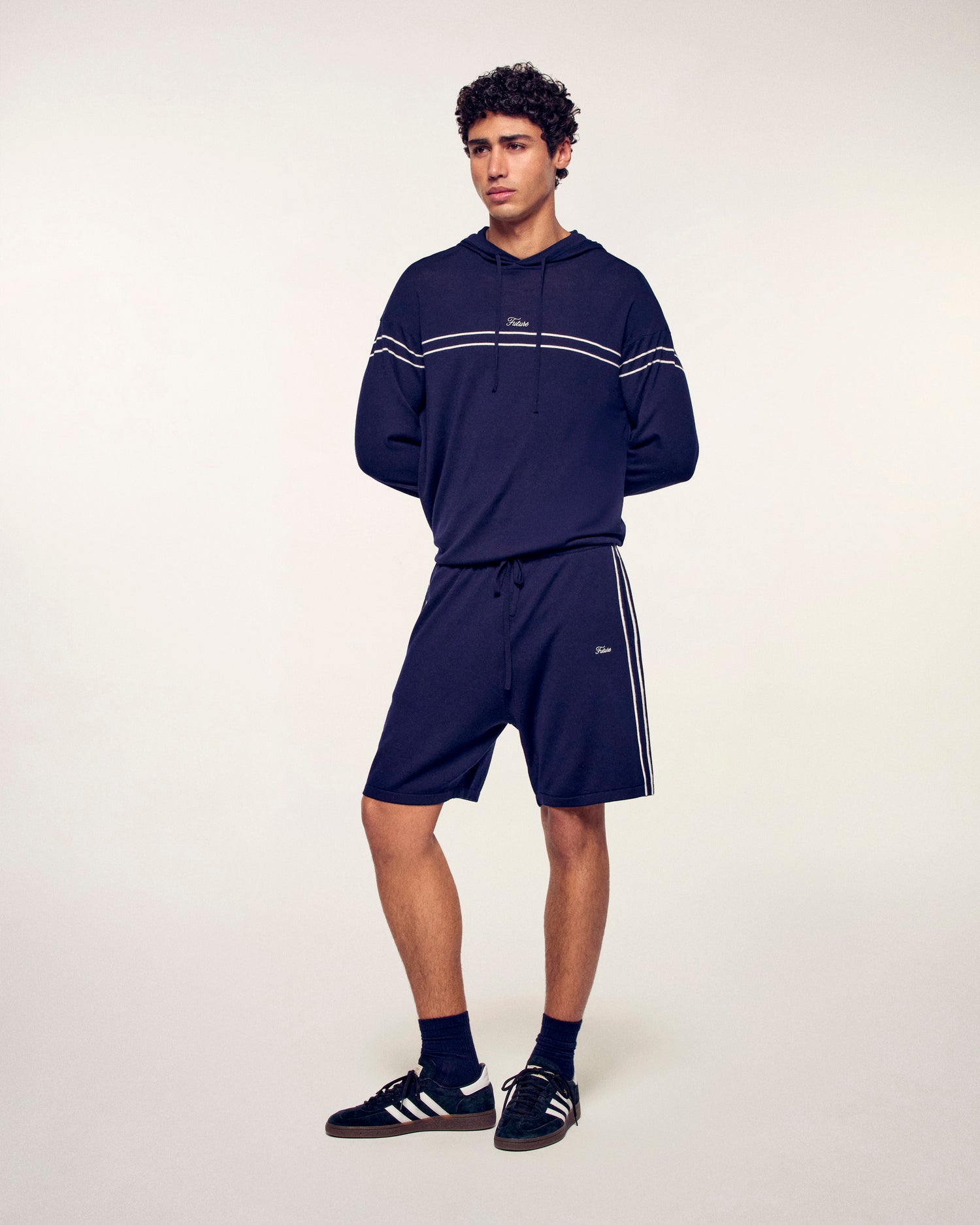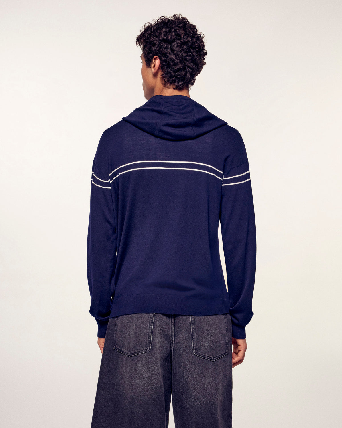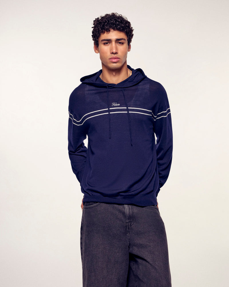 Un pull à capuche confectionné en laine mérinos, affichant un style urbain et raffiné grâce à sa broderie "Future" et ses fines rayures horizontales. Ses finitions soignées en font une pièce polyvalente, idéale pour un look décontracté mais élégant.