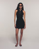 Une pièce iconique et sophistiquée qui sublime la silhouette avec élégance. Cette robe courte se distingue par son col montant boutonné et son décolleté goutte, agrémentés de boutons à strass étincelants pour une allure résolument couture.