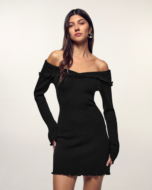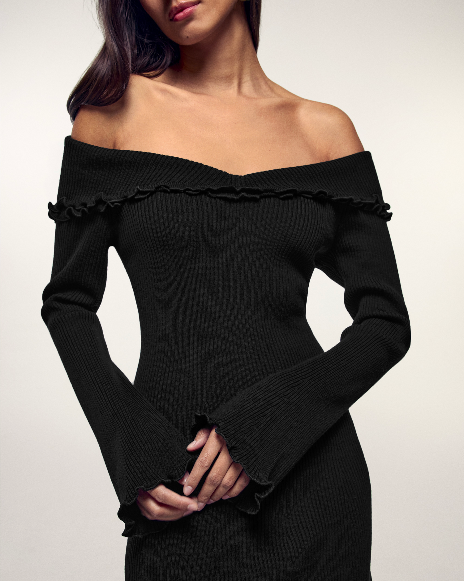 Pull Robe Courte Manches Longues Col Bardot - 100% Laine Mérinos - Certifiée RWS - Noir
