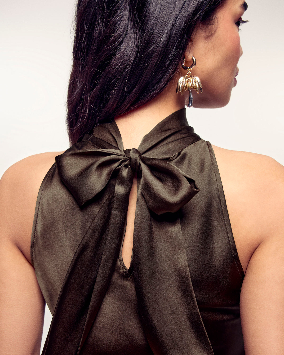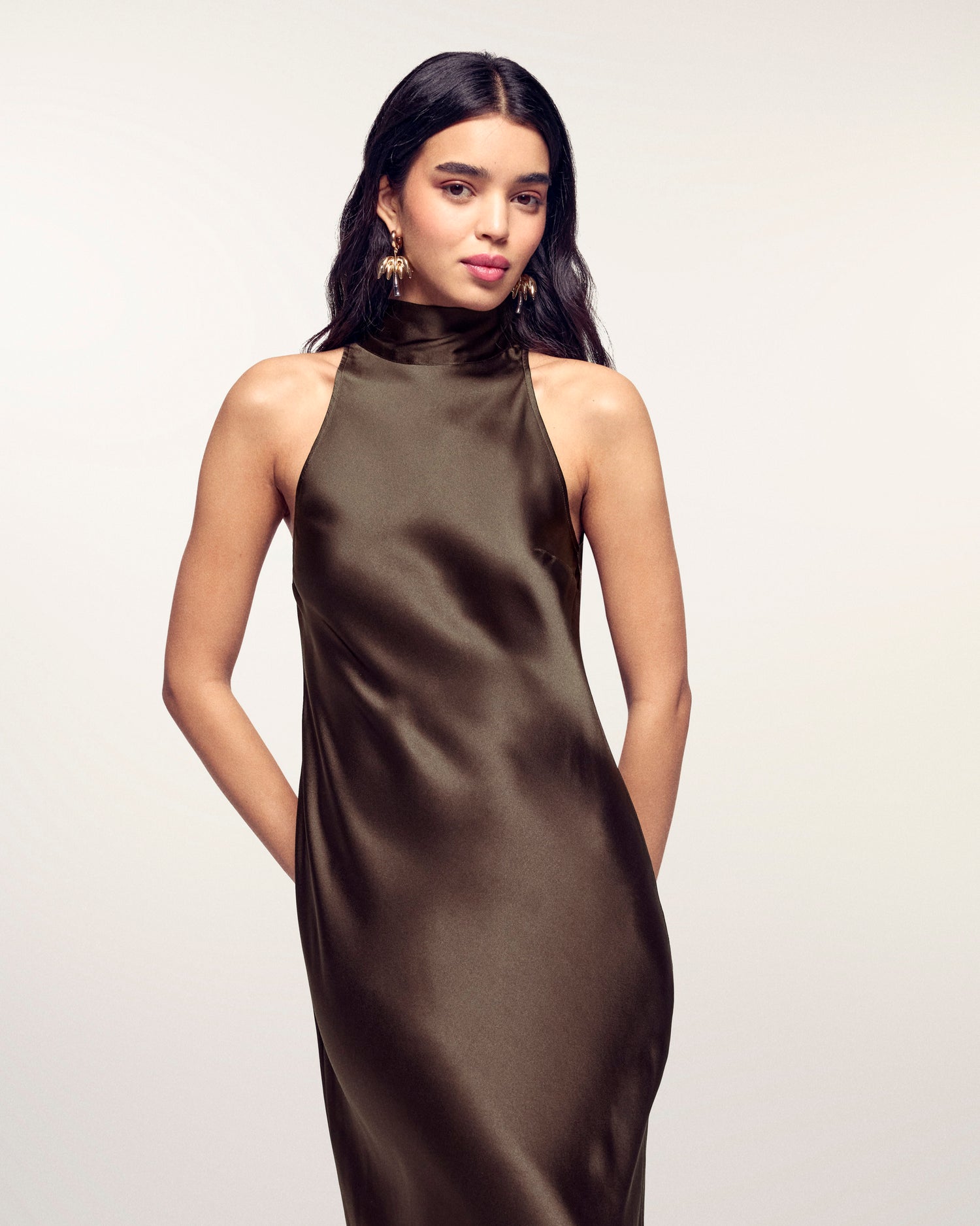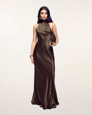 Une pièce de haute élégance. Confectionnée en 100% Soie (Satin de soie) pour un tombé fluide et luxueux, cette robe longue présente un col écharpe sophistiqué qui se noue autour du cou. Sa coupe slim sublime la silhouette pour un look de soirée incomparable.
