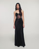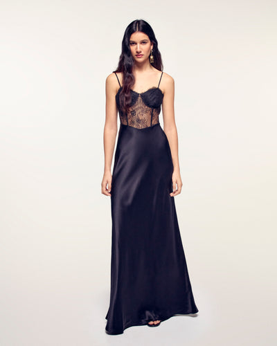 Cette robe longue est confectionnée en 100% Soie pour le bas et présente un haut corset en dentelle, offrant une silhouette sensuelle et sophistiquée. Une pièce incontournable pour les soirées.